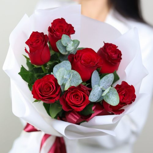 Букет из 7 красных роз и эвкалипта