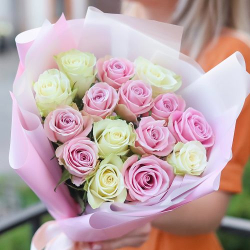 Букет нежных белых и розовых роз в оформлении