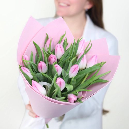 Букет нежно-розовых тюльпанов в оформлении