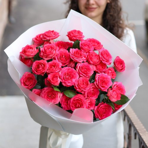 Букет стойких розовых роз в оформлении