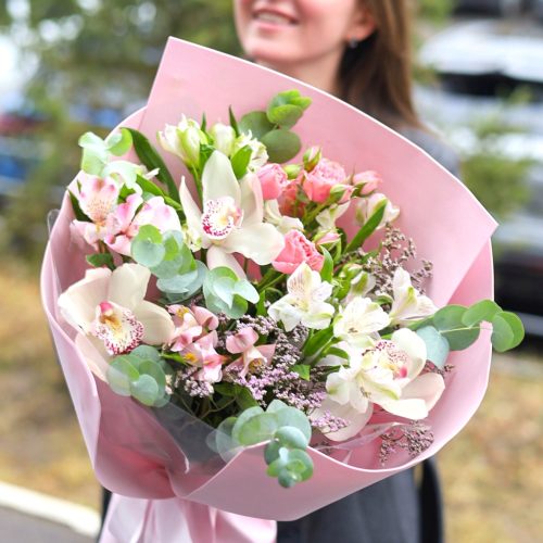 Объемный и стойкий букет с альстромерией и кустовыми розами