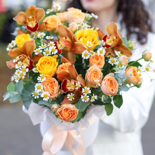 Осенний букет с орхидеями и ромашками