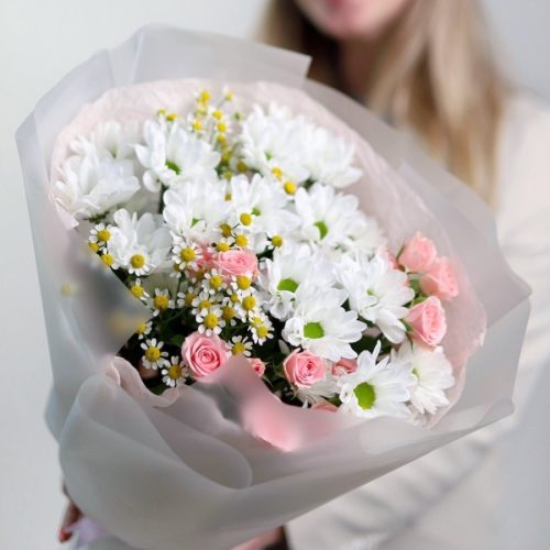 Ароматный букет ромашек и кустовых роз