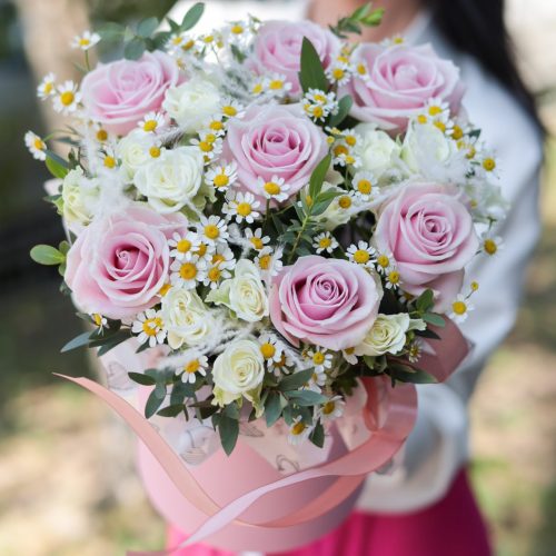 Чарующий букет розовых роз и ромашек