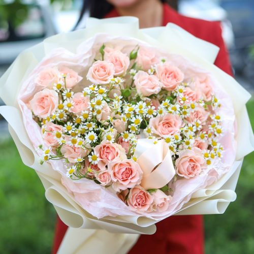 Ароматный букет кустовых роз и ромашек