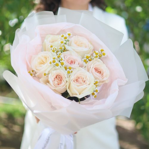 Ароматный букет пионовидных роз и ромашек