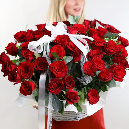 51 красная роза с эвкалиптом в корзине