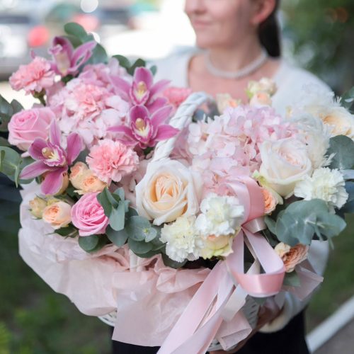 Корзина с гортензиями и орхидеями