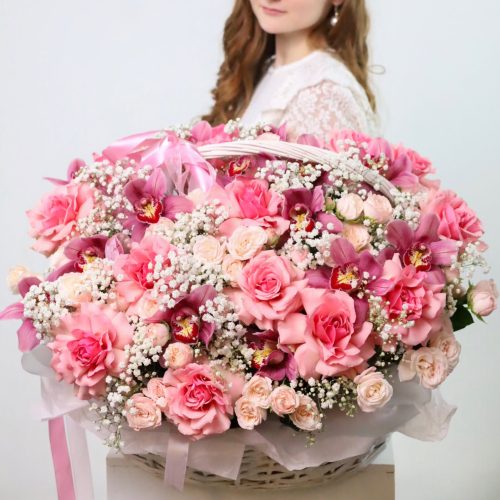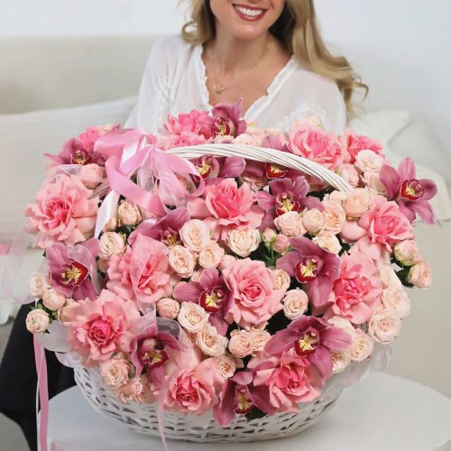 Роскошная корзина крупных роз и орхидей