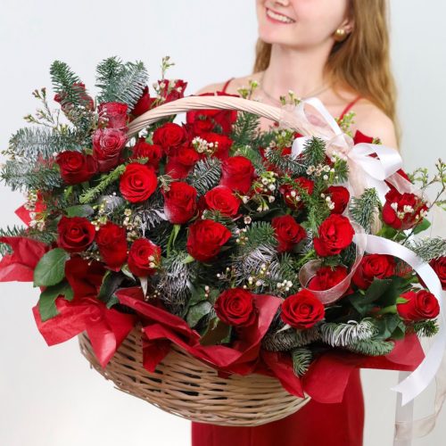 Большая корзина красных роз и нобилиса