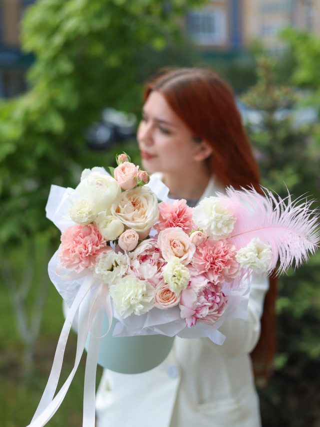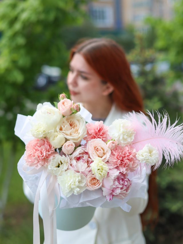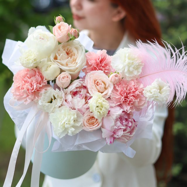 В составе: кустовые и одноголовые пионовидные розы, стойкие диантусы, ажурная эустома, пионы, декоративное перо.