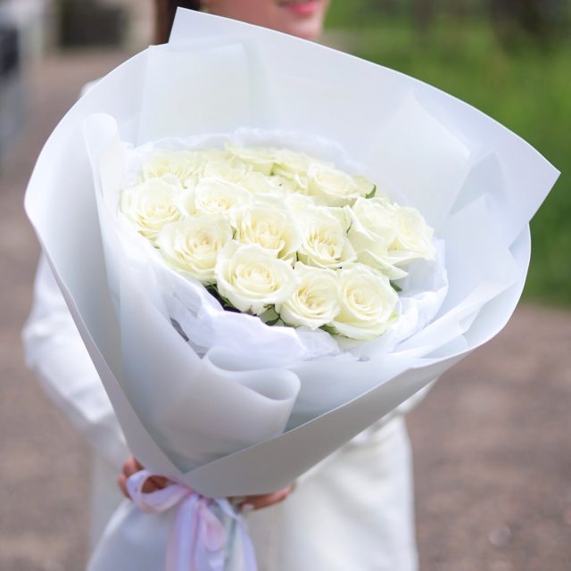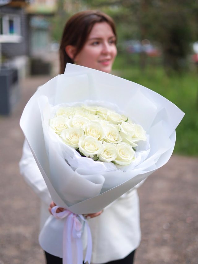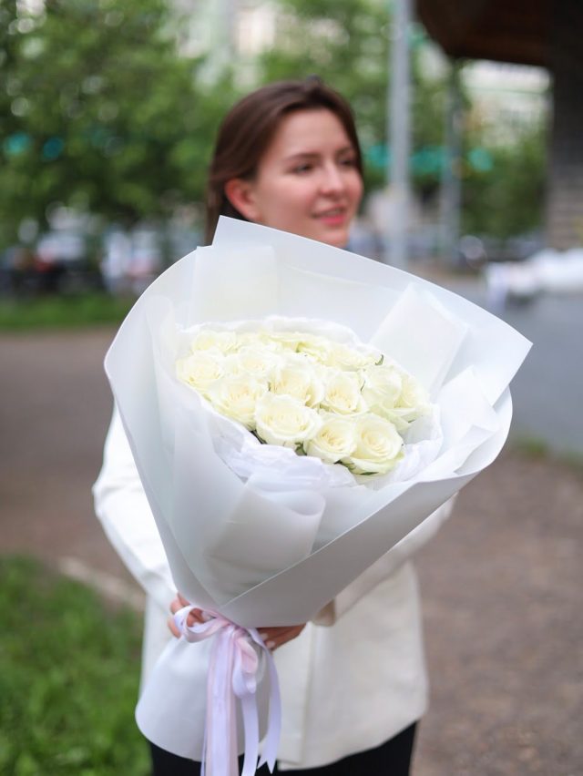 Прекрасный букет из 19-ти белых роз в стильном оформлении.