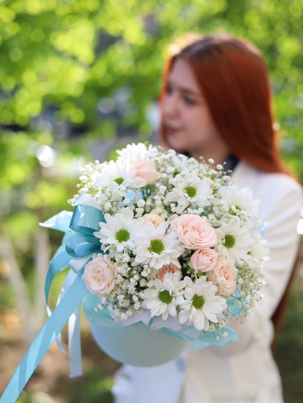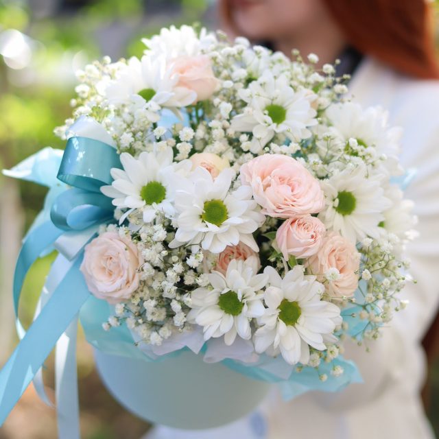Состав: кустовые пионовидные розы, стойкая хризантема и гипсофила.
