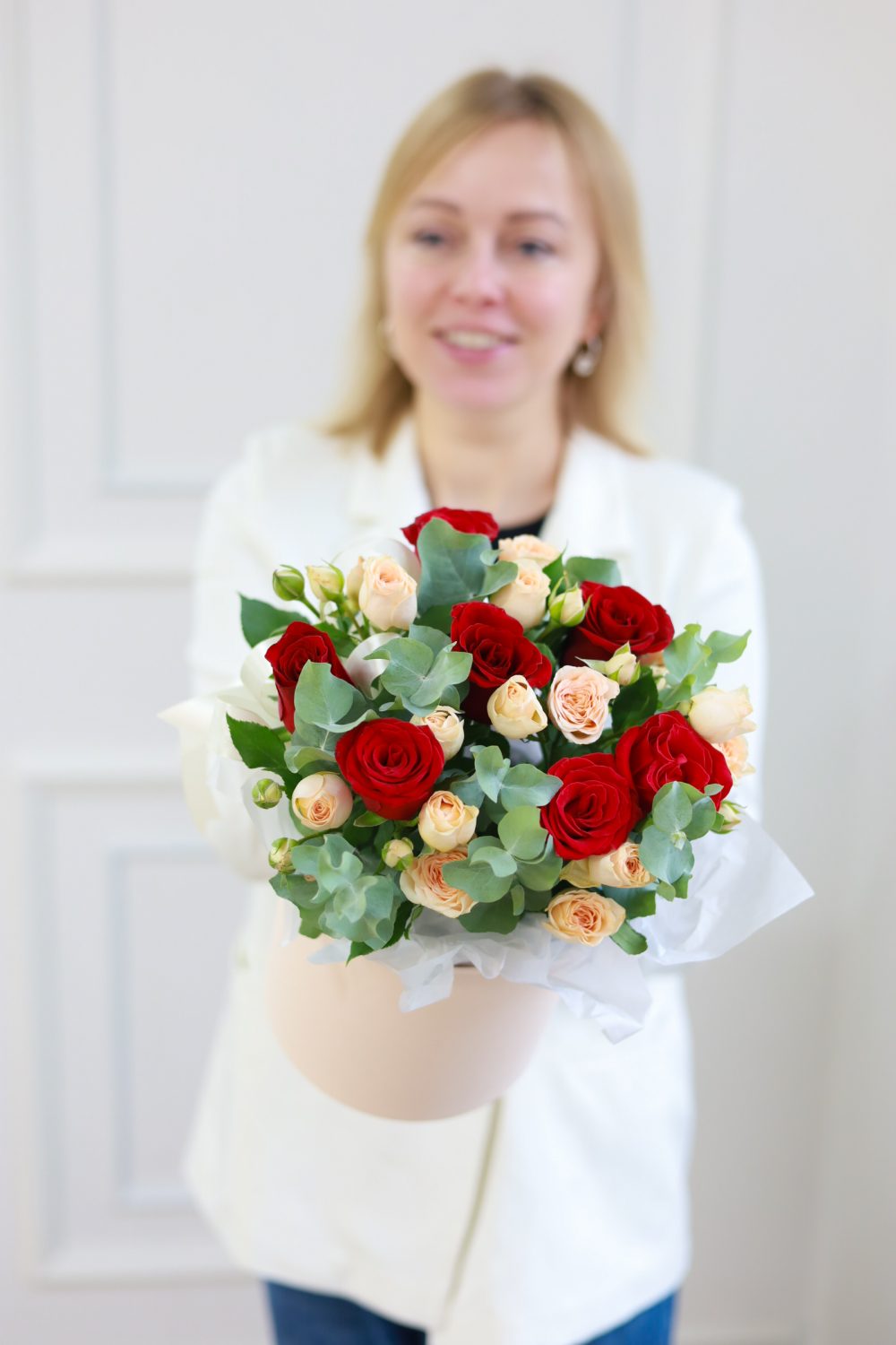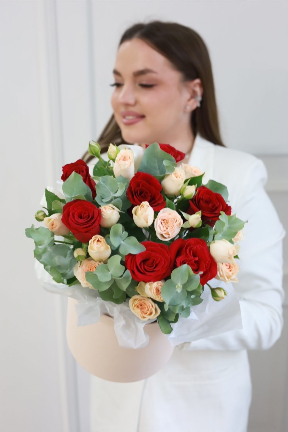 Красивая композиция из кустовых и одноголовых роз с душистым эвкалиптом в шляпной коробке.