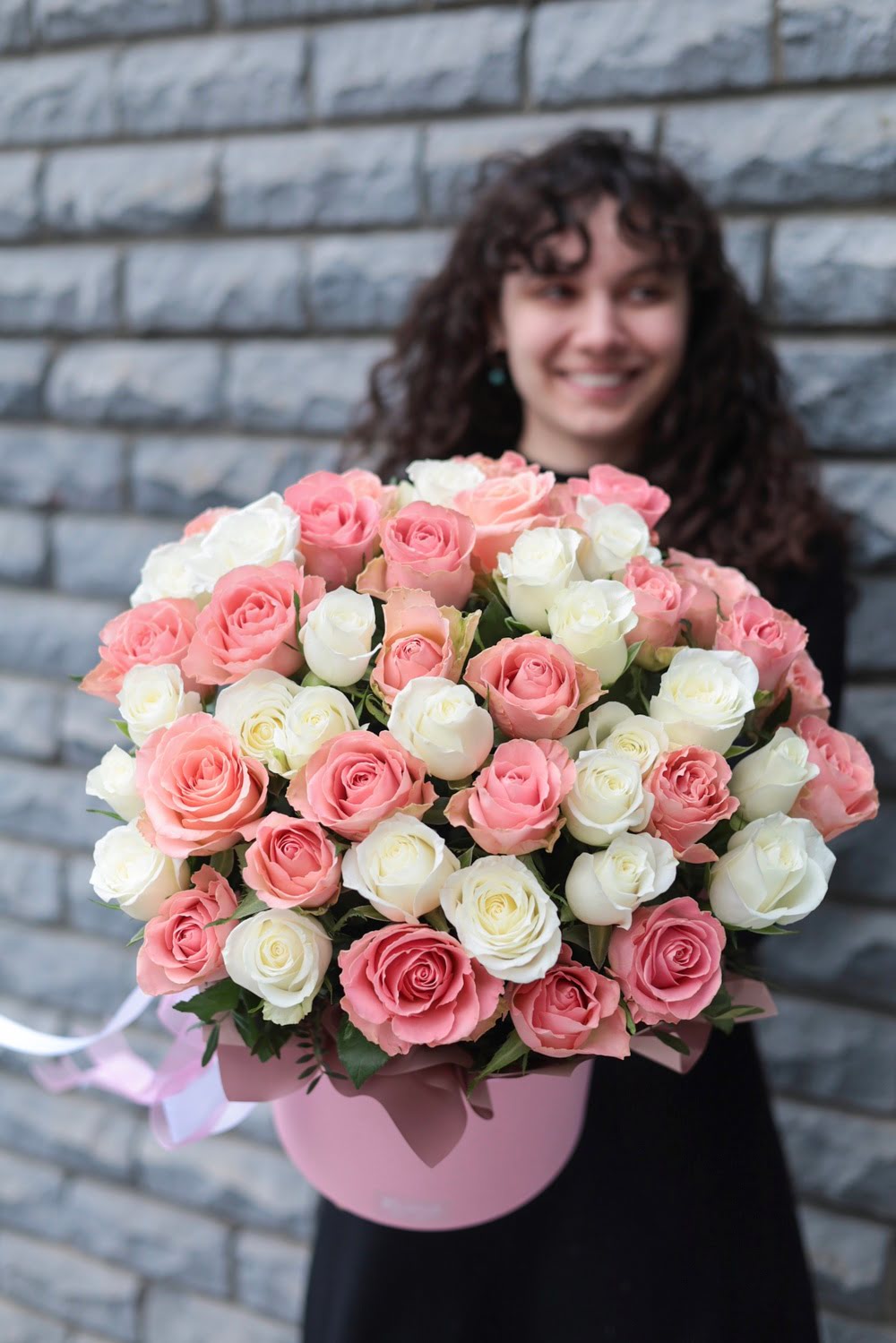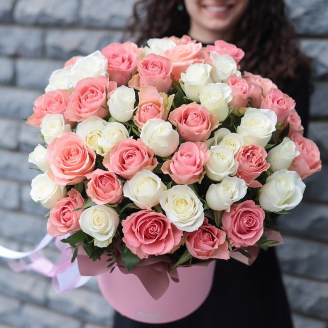 51 белая и розовая роза в шляпной коробке