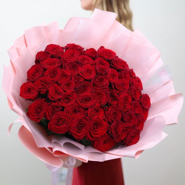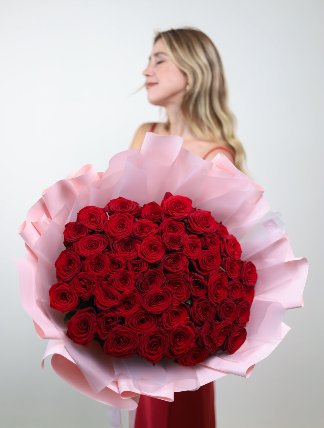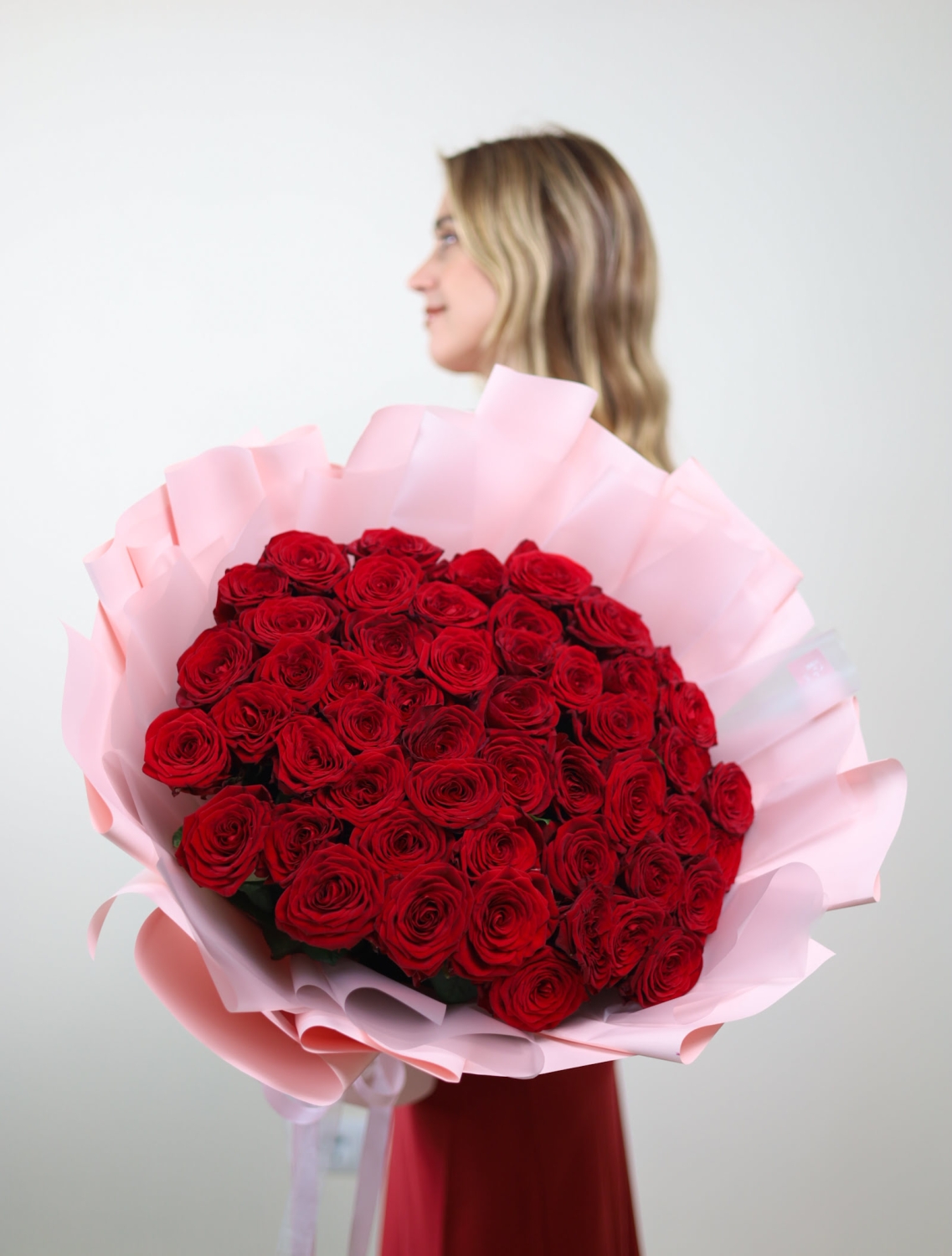 Великолепный букет из 51-ой ароматной розы с крупным бутоном сорта Ред Наоми в стильном оформлении.
