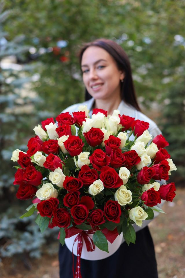 Прекрасная композиция из 51-ой красной и белой розы микс.