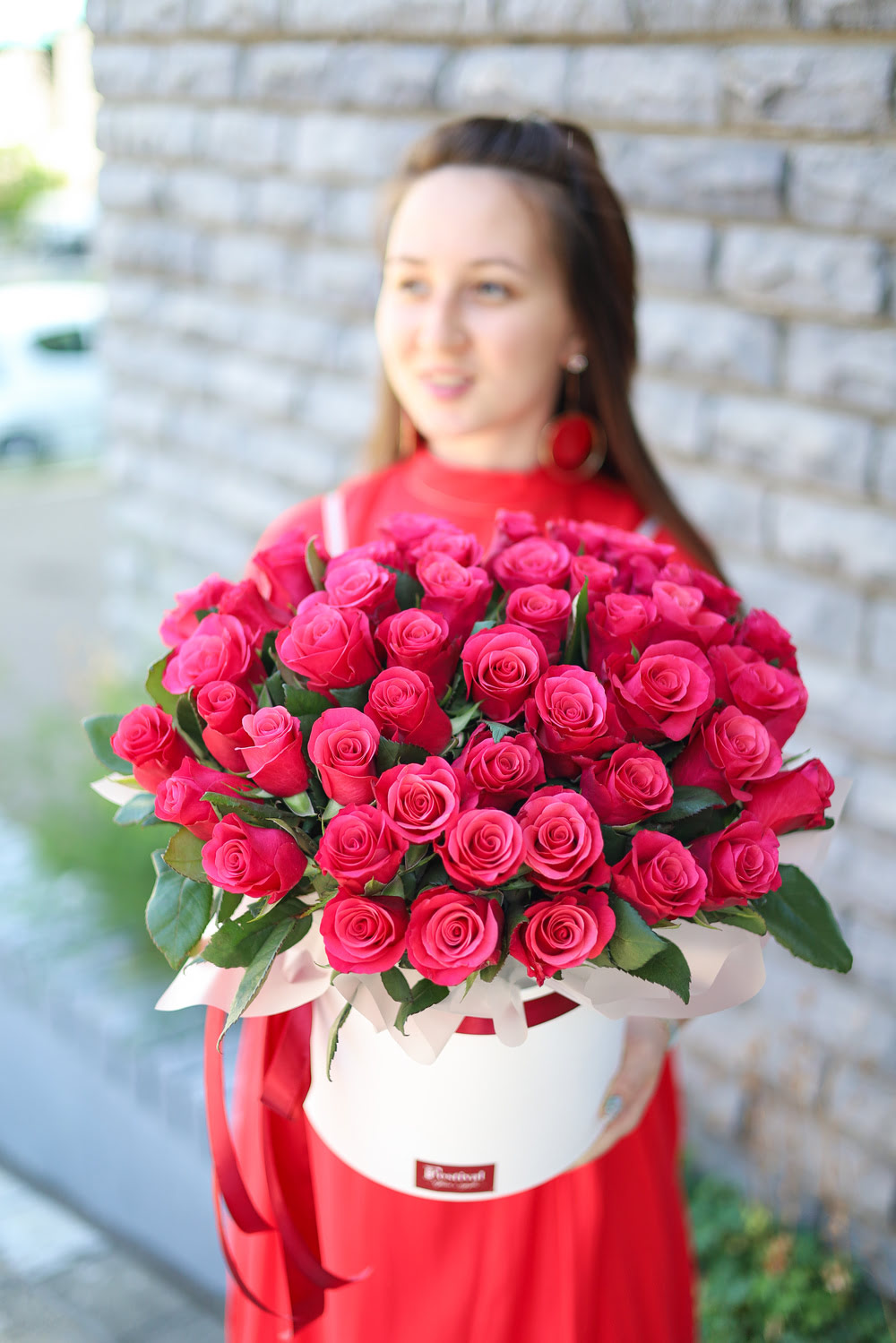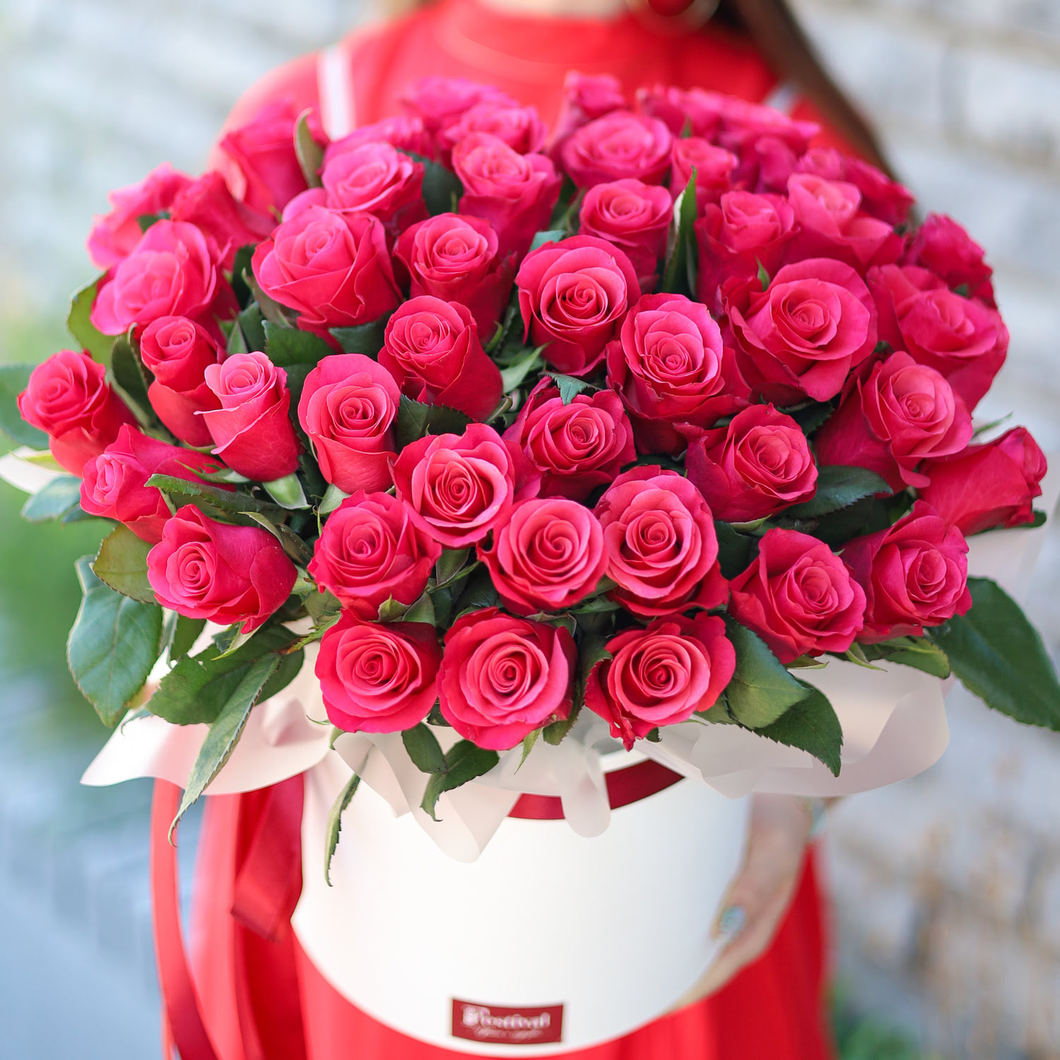 Роскошная коробка малиновых роз в шляпной коробке. 51 шт.