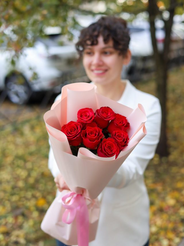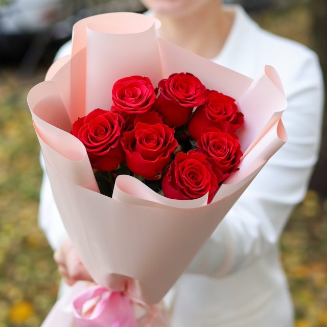 Красивый аккуратный букет из 7-ми красных роз в оформлении.