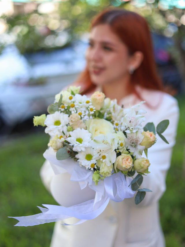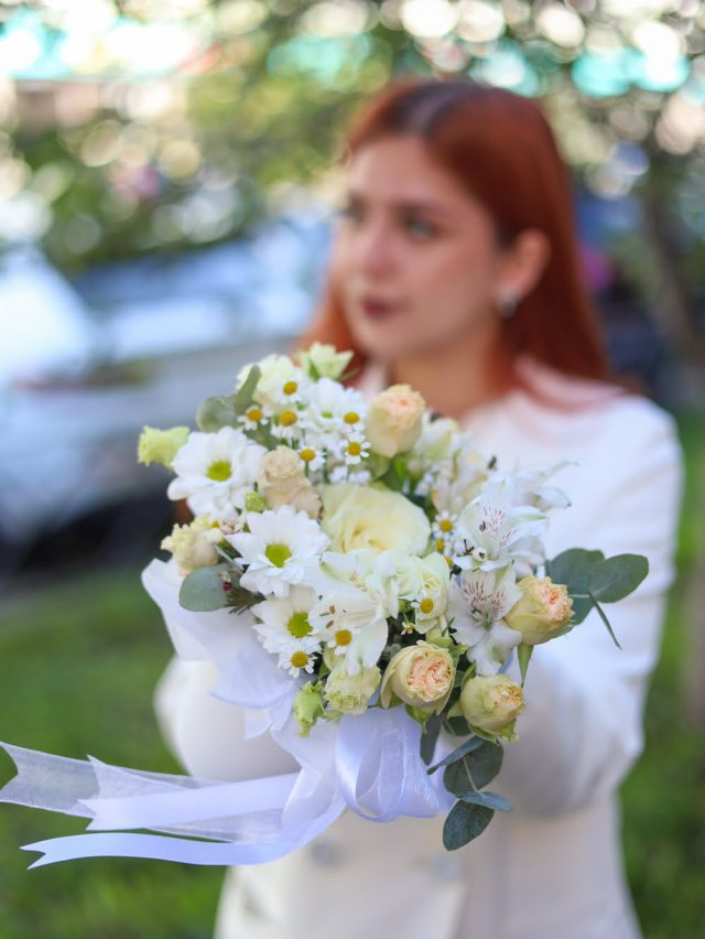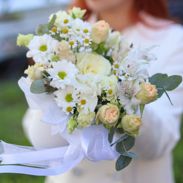 Состав: кустовые пионовидные розы, ароматные ромашки, стойкие хризантема и альстромерия, эустома, одноголовая роза, эвкалипт.