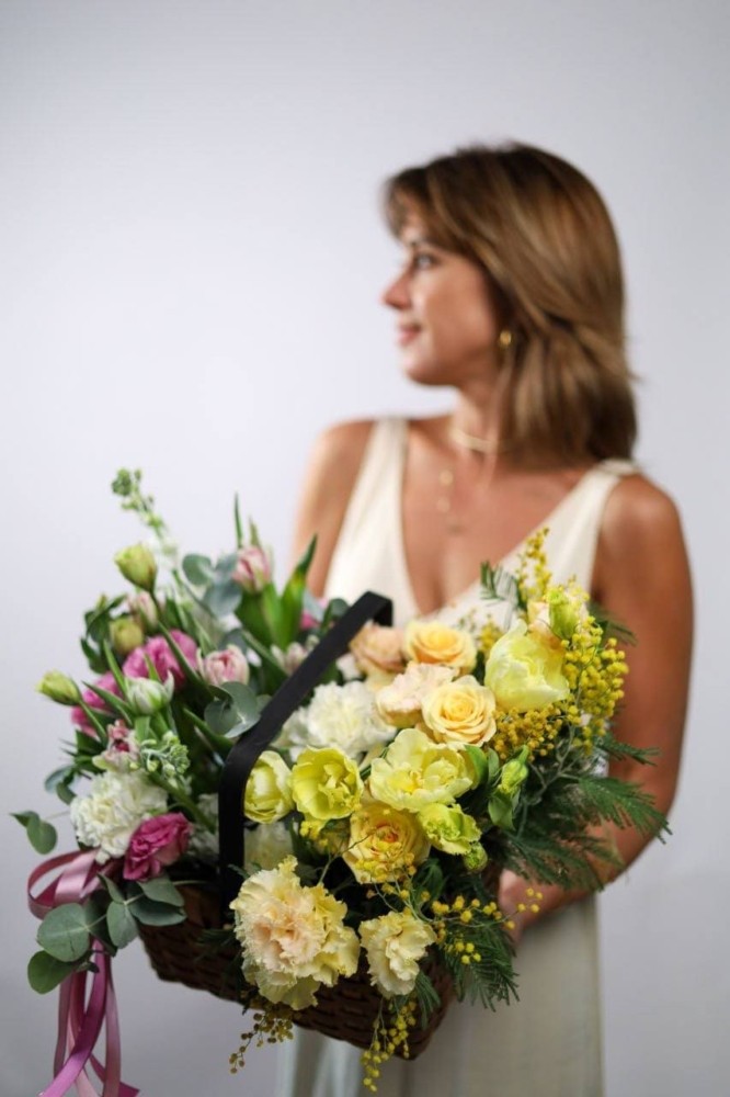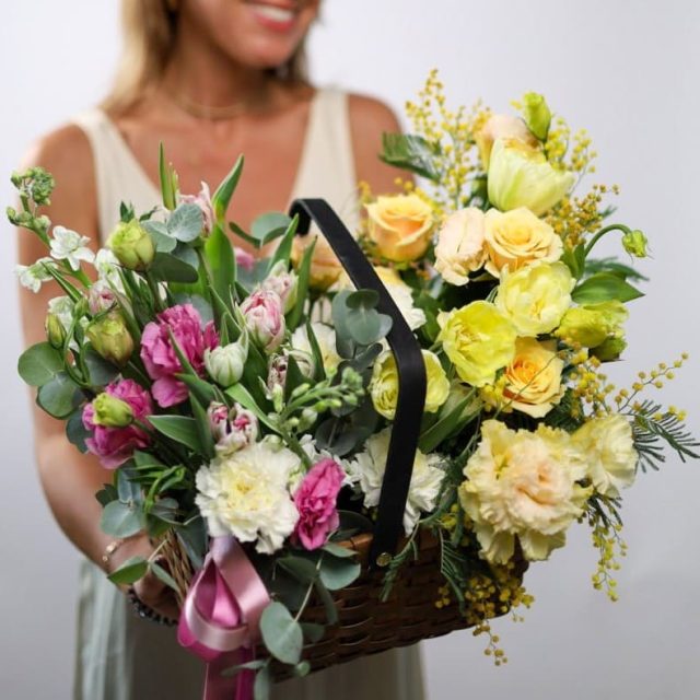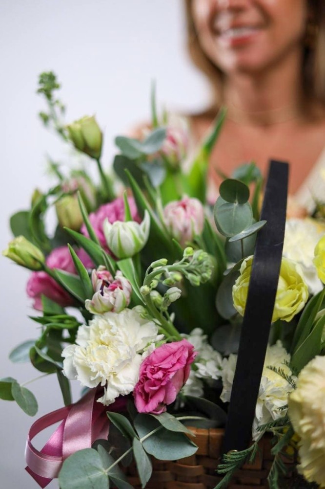В композиции: нежная эустома, пионовидные тюльпаны, одноголовые розы, стойкие диантусы, ароматная маттиола, эвкалипт, яркая мимоза.
