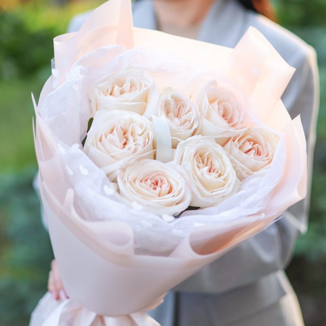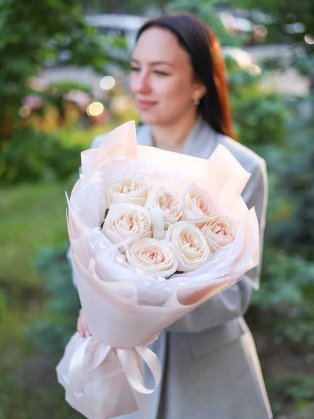 Самые ароматные среди всех роз – пионовидные розы сорта Вайт О’Хара в оформлении. Букет из 7-ми роз.