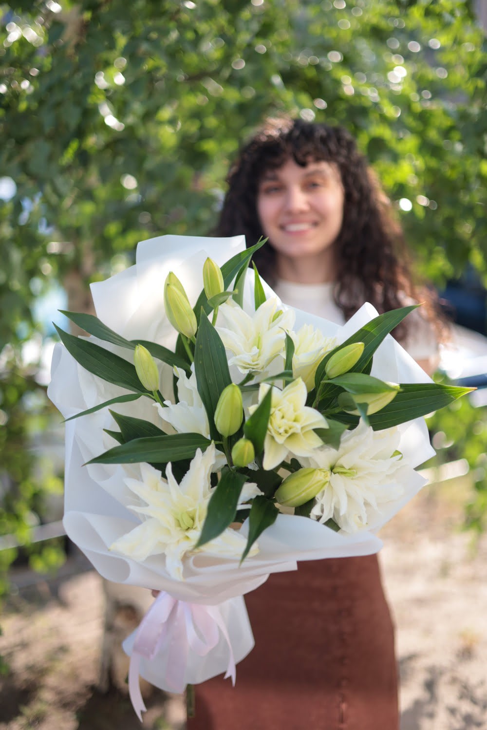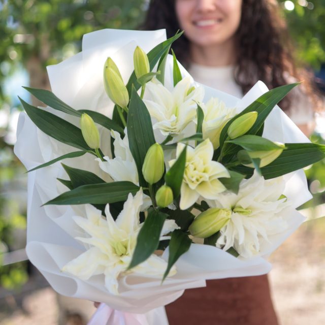 Прекрасный букет из белых лилий с крупным бутоном в стильном оформлении.