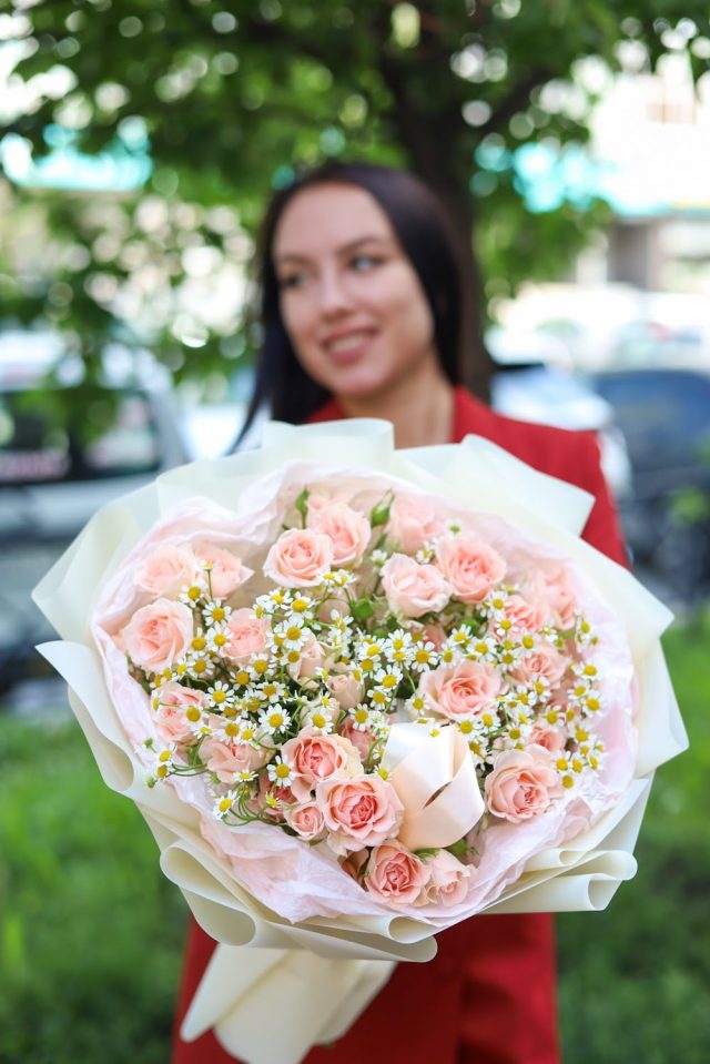 Состав: 7 веток кустовых роз, ароматные ромашки.