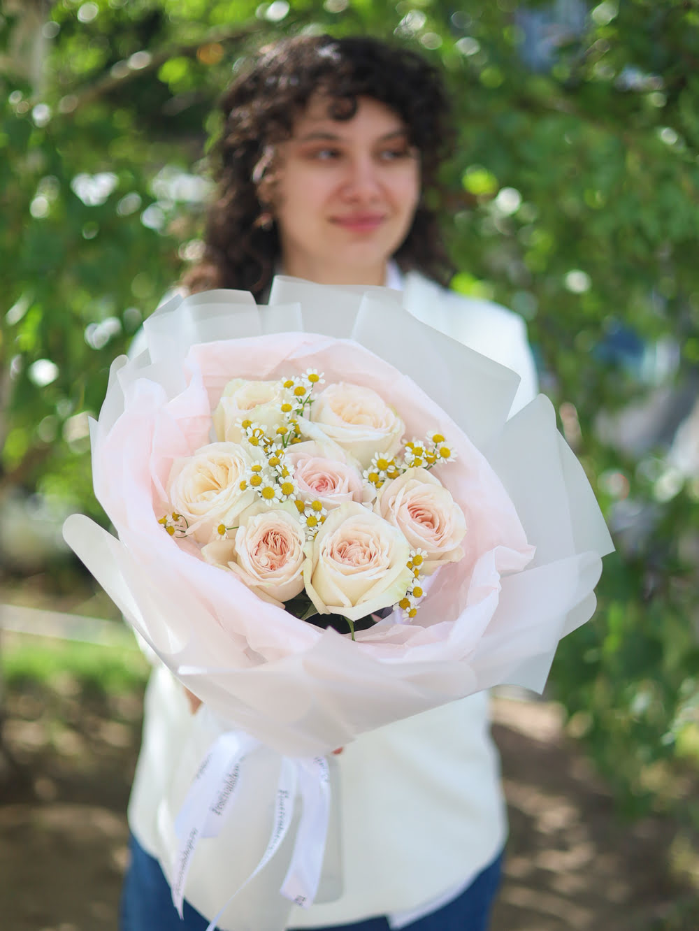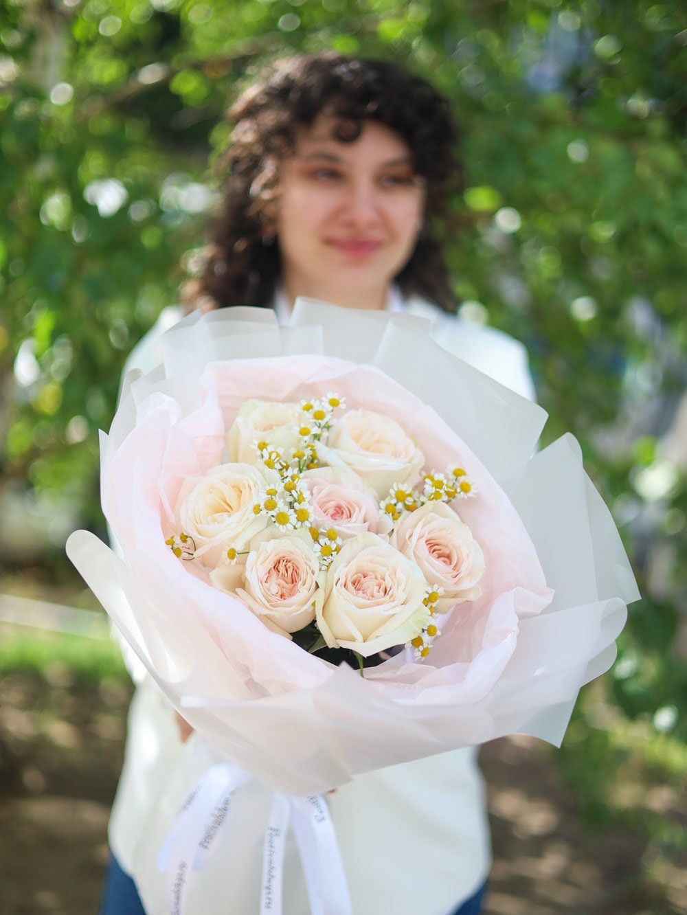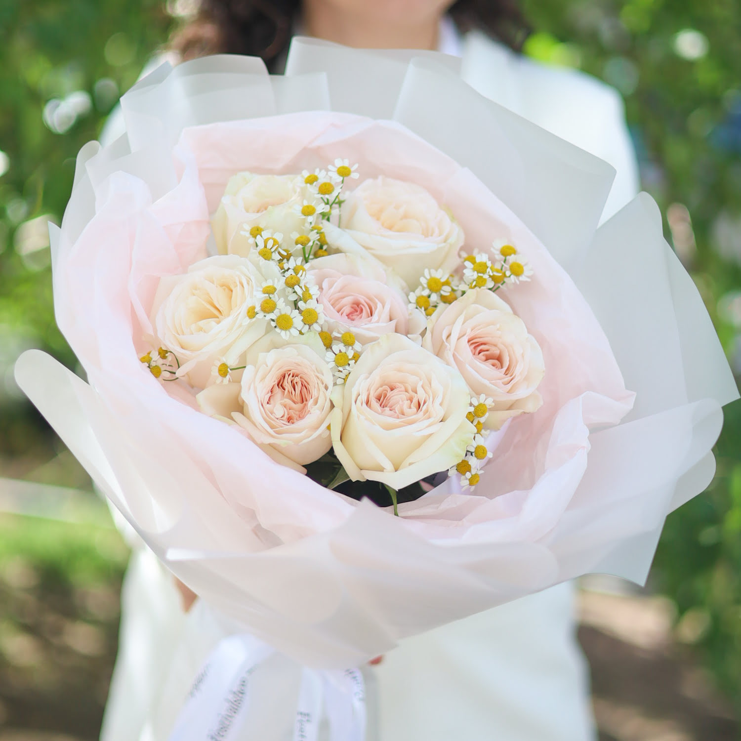 Состав: одноголовые пионовидные розы сорта White O’Hara и ромашки.