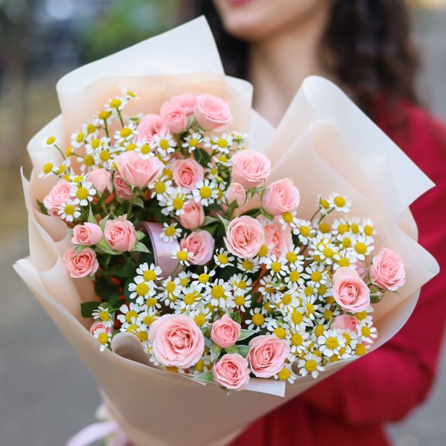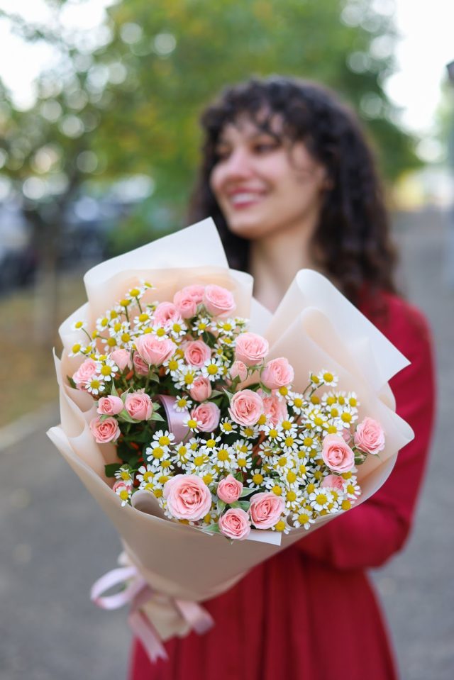 Очаровательный букет из ароматных ромашек (танацетума) и кустовых роз.