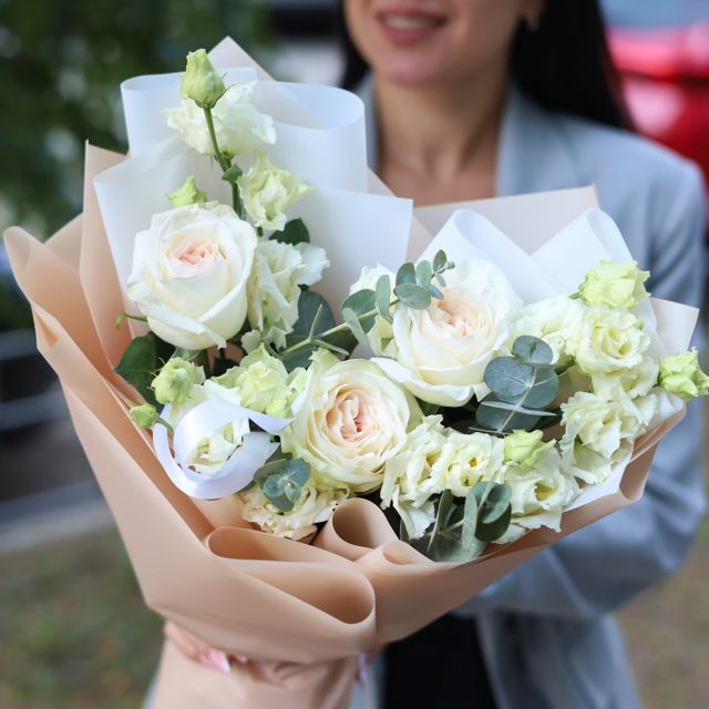 В букете: три крупные пионовидные розы, ажурная эустома и эвкалипт. Высота около 50 см.