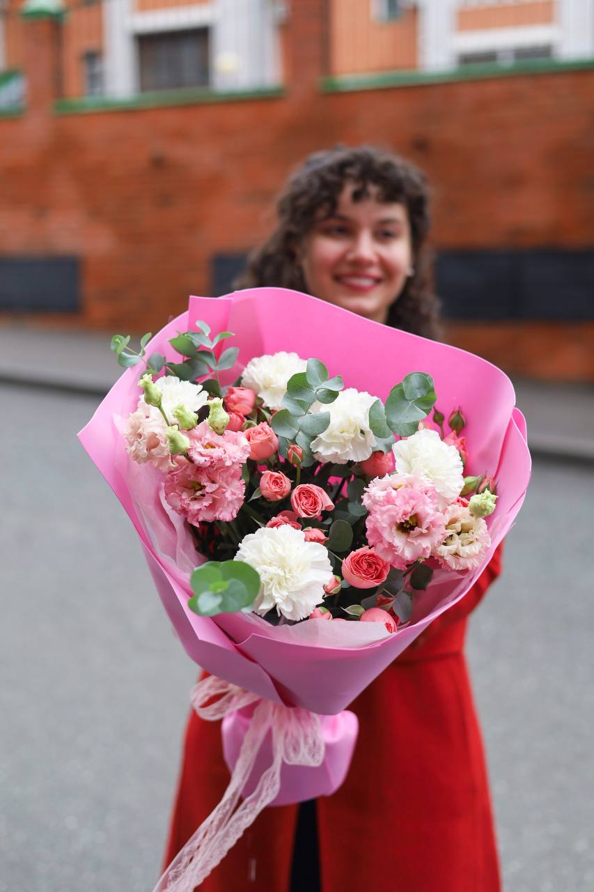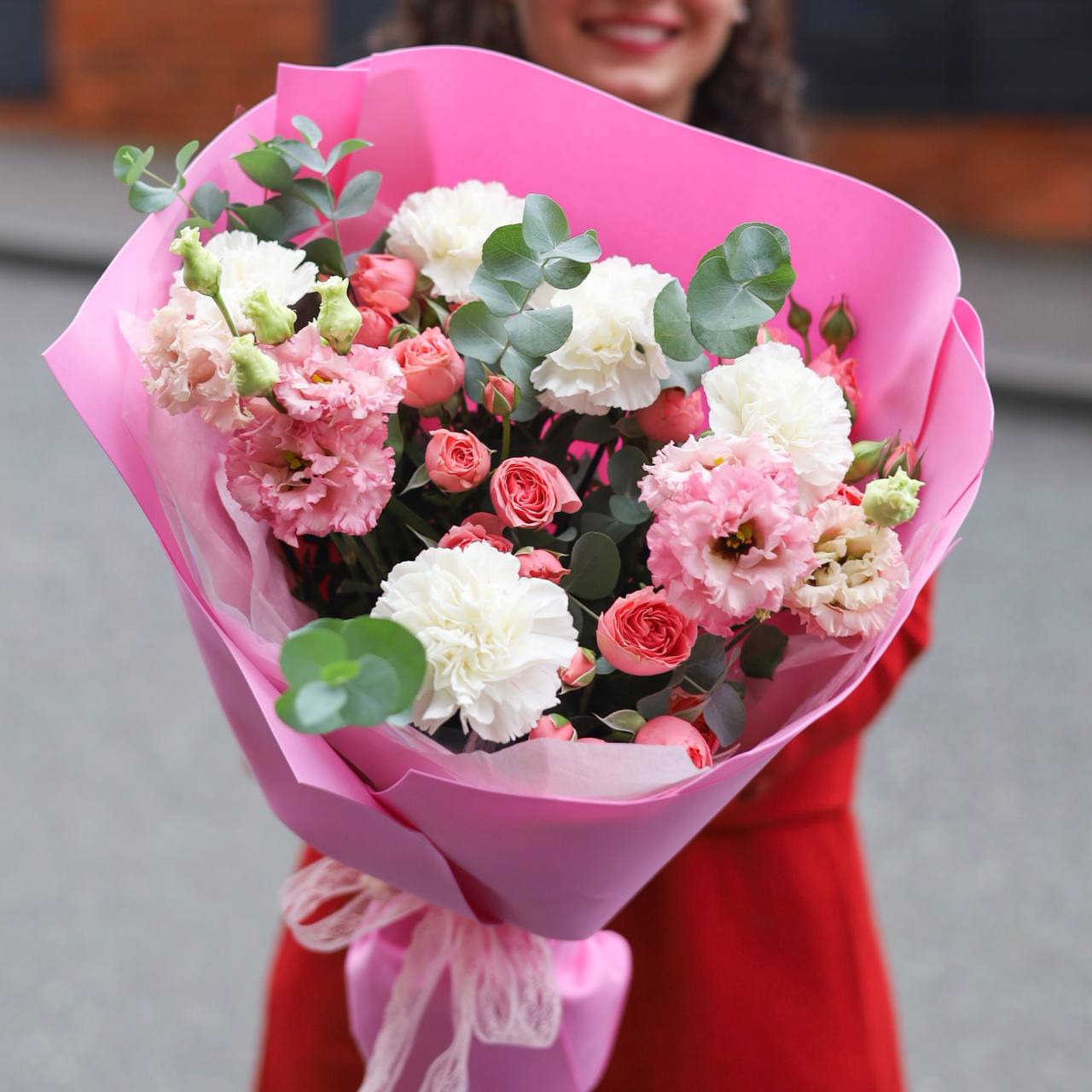 В букете: кустовые пионовидные розы, стойкие диантусы, нежная эустома, эвкалипт.