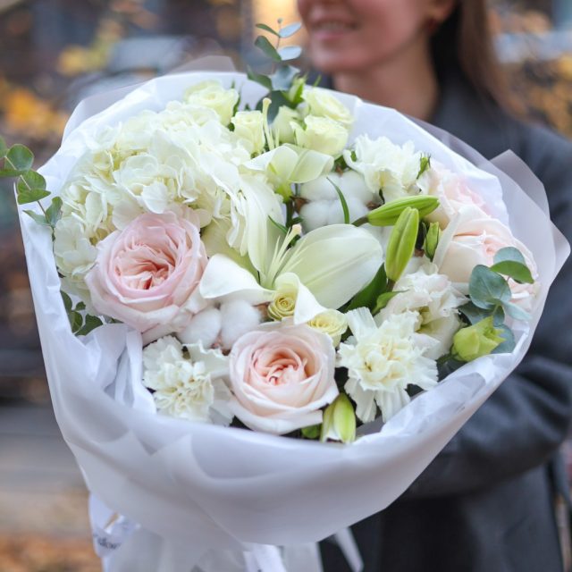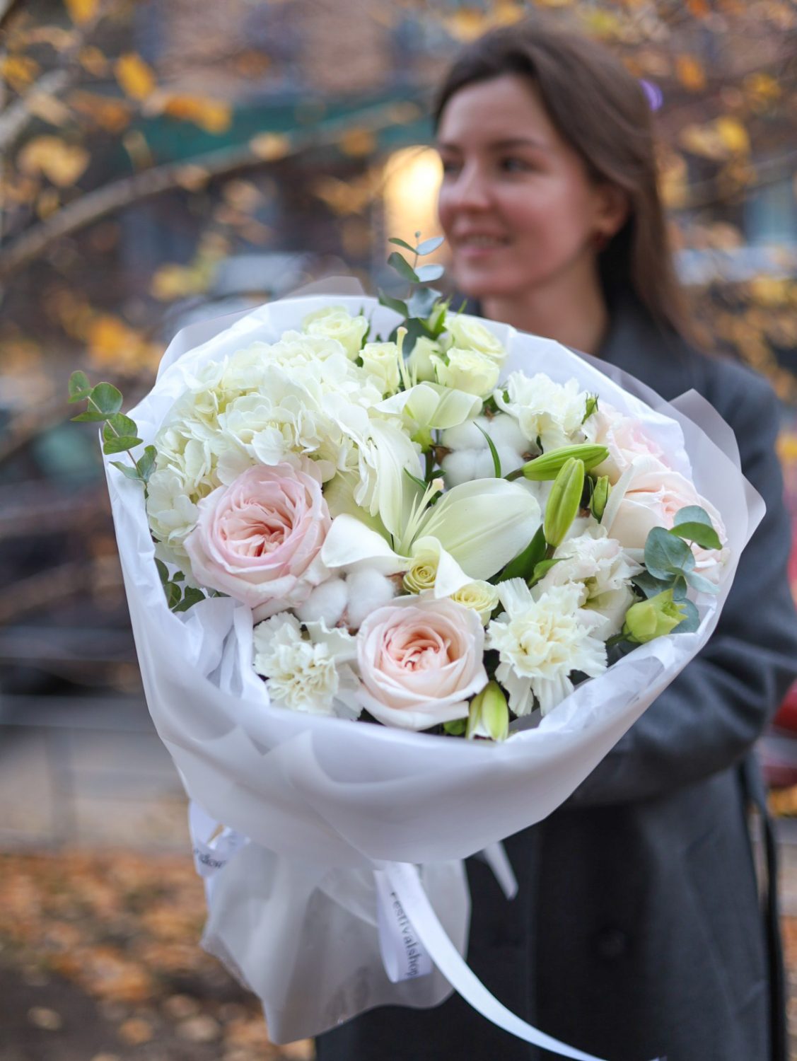 Нежный букет с лилией, розами, диантусами, эустомой, хлопком и эвкалиптом.