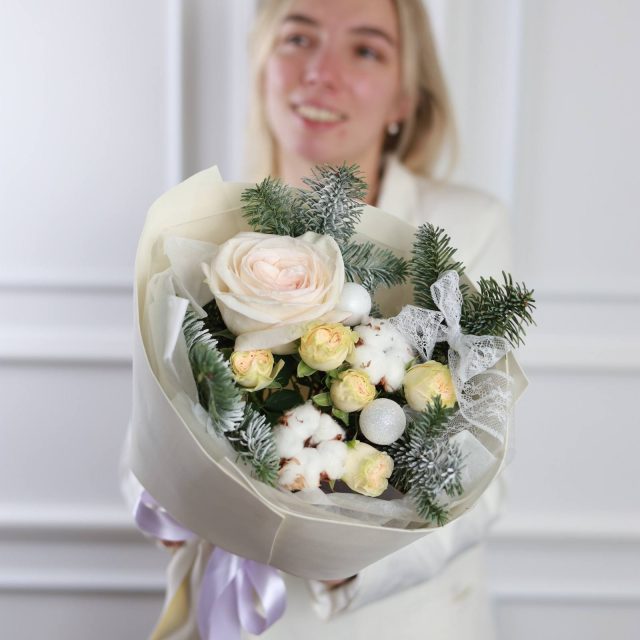 Милый букет с одноголовой крупной и кустовыми розами, хлопком и елью нобилис.