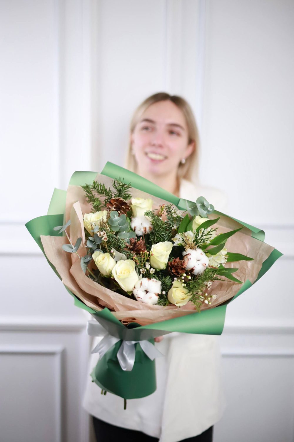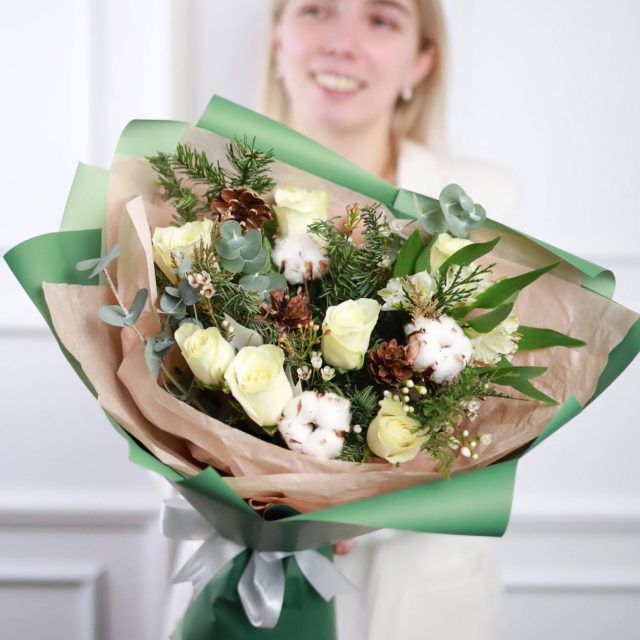 Авторский букет с одноголовыми розами, альстромерией, хлопком, шишками, хаммелациумом, эвкалиптом и елью нобилис.