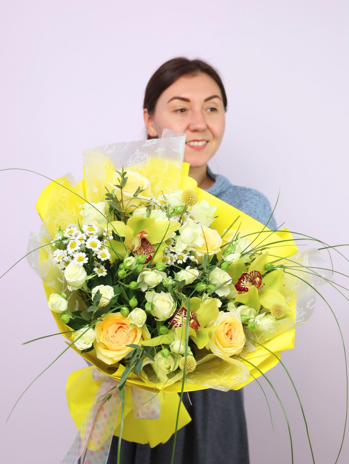 Состав: стойкие орхидеи и хризантема, одноголовые и кустовые розы, краспедия, зелень.