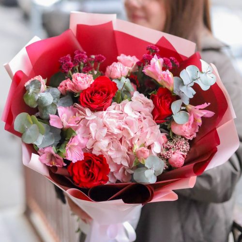 Состав: французская роза, ароматные лилии, стойкие диантусы, кустовые пионовидные лилии, сухоцветы.
