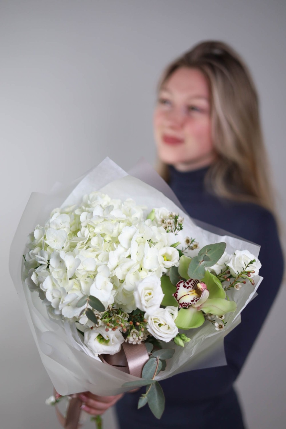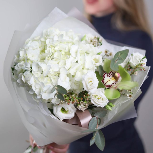 Красивый букет с крупной гортензией, орхидеей, эустомой, хамелациумом и эвкалиптом.