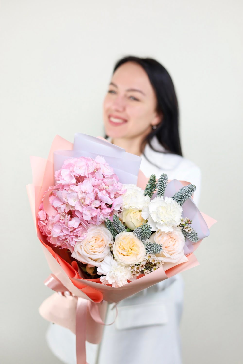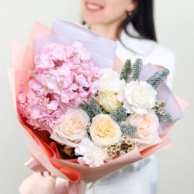 Состав: одноголовые и кустовые пионовидные розы, пышная гортензия, стойкие диантус, хамелациум, нобилис. Высота около 50 см.