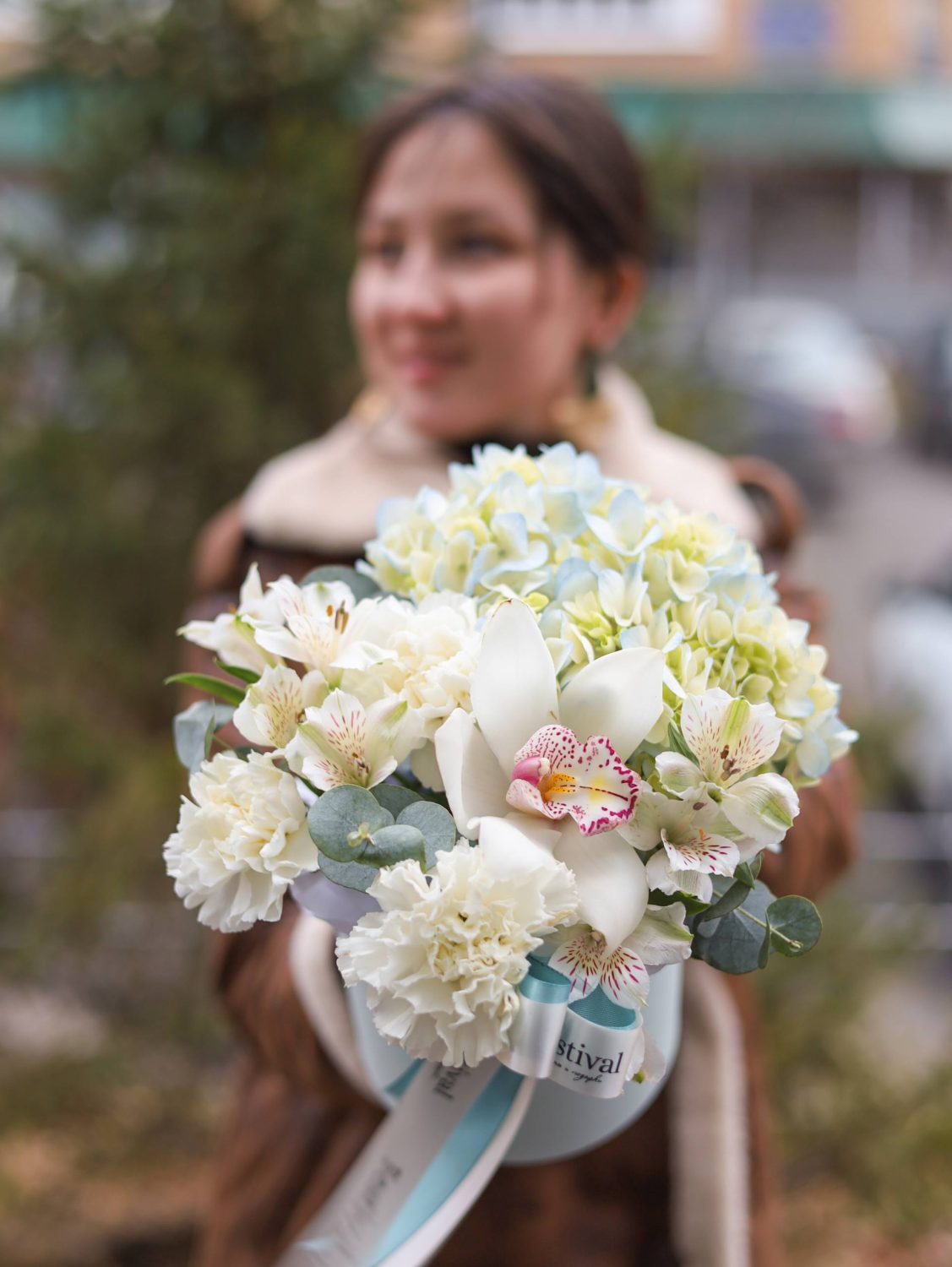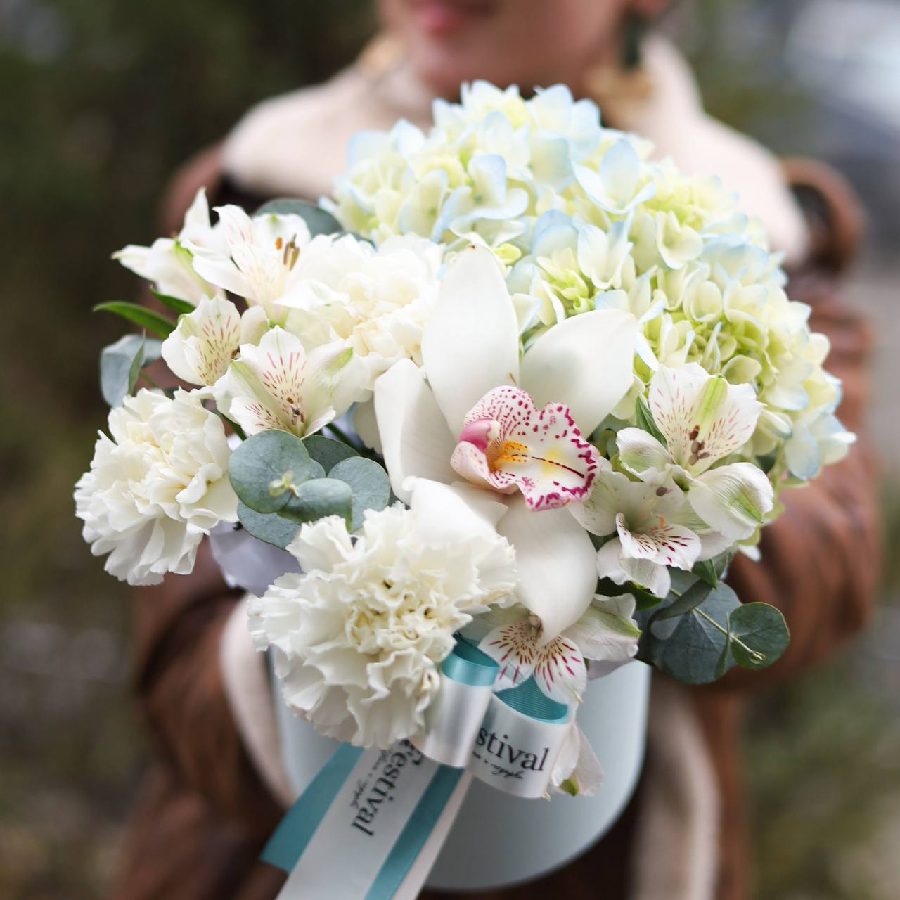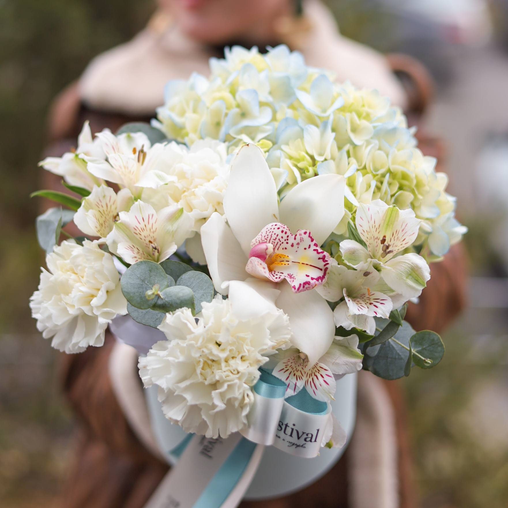 Состав: орхидея, диантусы, гортензия , альстромерия, эвкалипт.