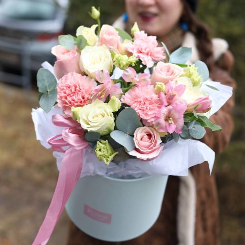 Роскошная композиция в чарующих нежных оттенках со сборным составом ароматных цветов. Композиция выполнена в шляпной коробке и украшена атласными лентами.