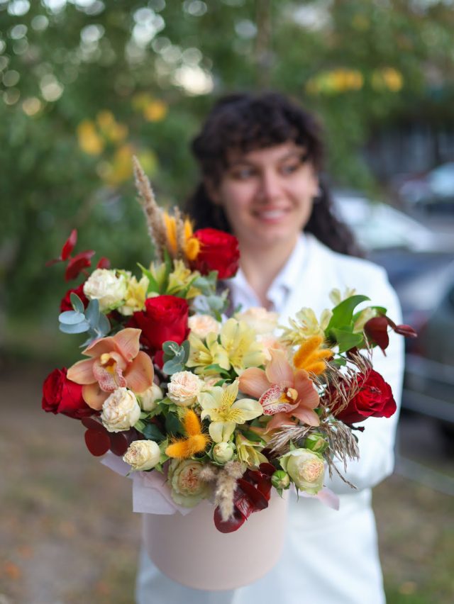 Состав: кустовые пионовидные розы, стойкие орхидеи и альстромерия, одноголовые розы, сухоцветы, эвкалипт.