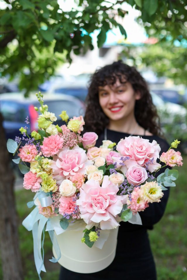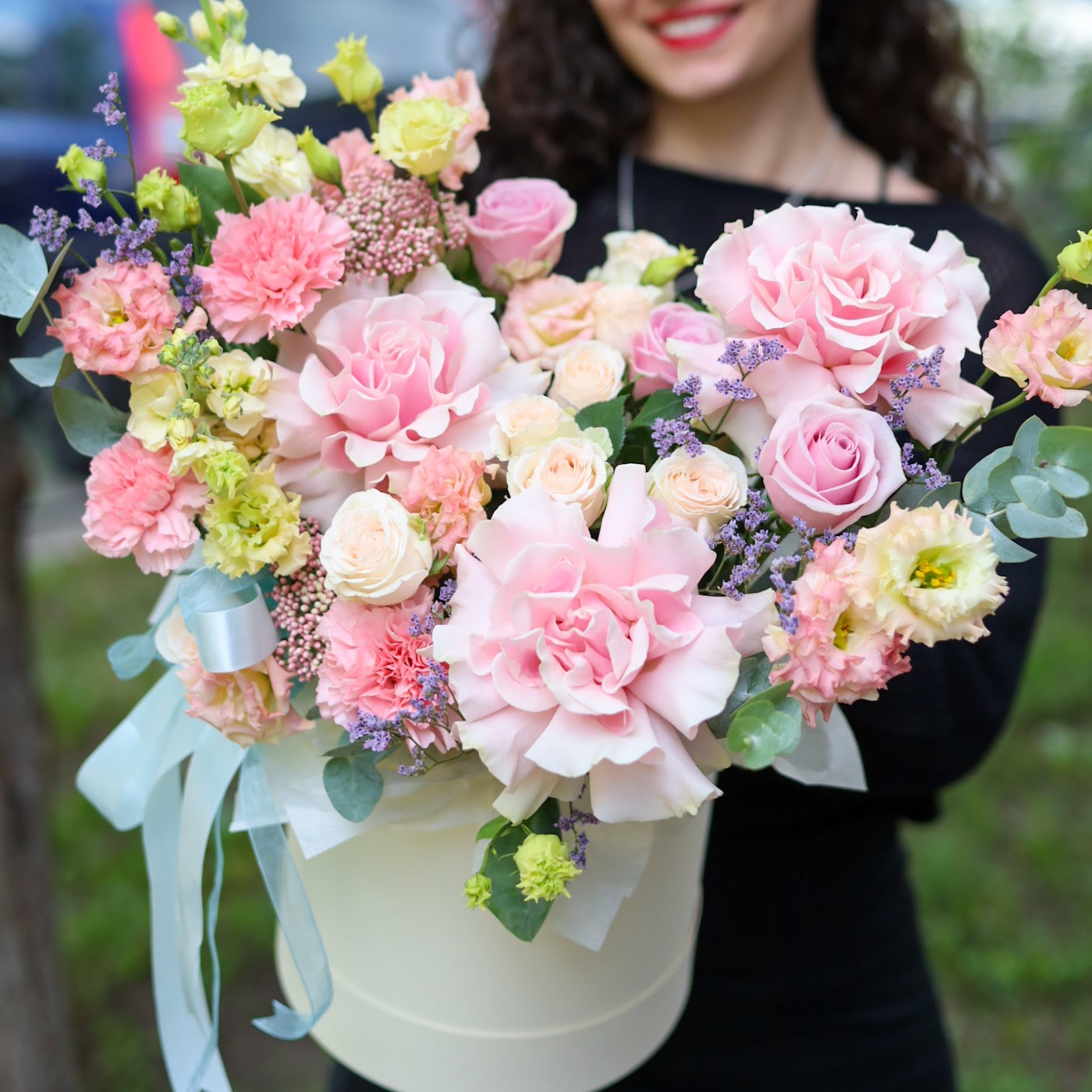 Состав: крупные французские розы, стойкие диантусы, кустовые и одноголовые розы, ажурная эустома, ароматная маттиола, озотамнус, лимониум, душистый эвкалипт.