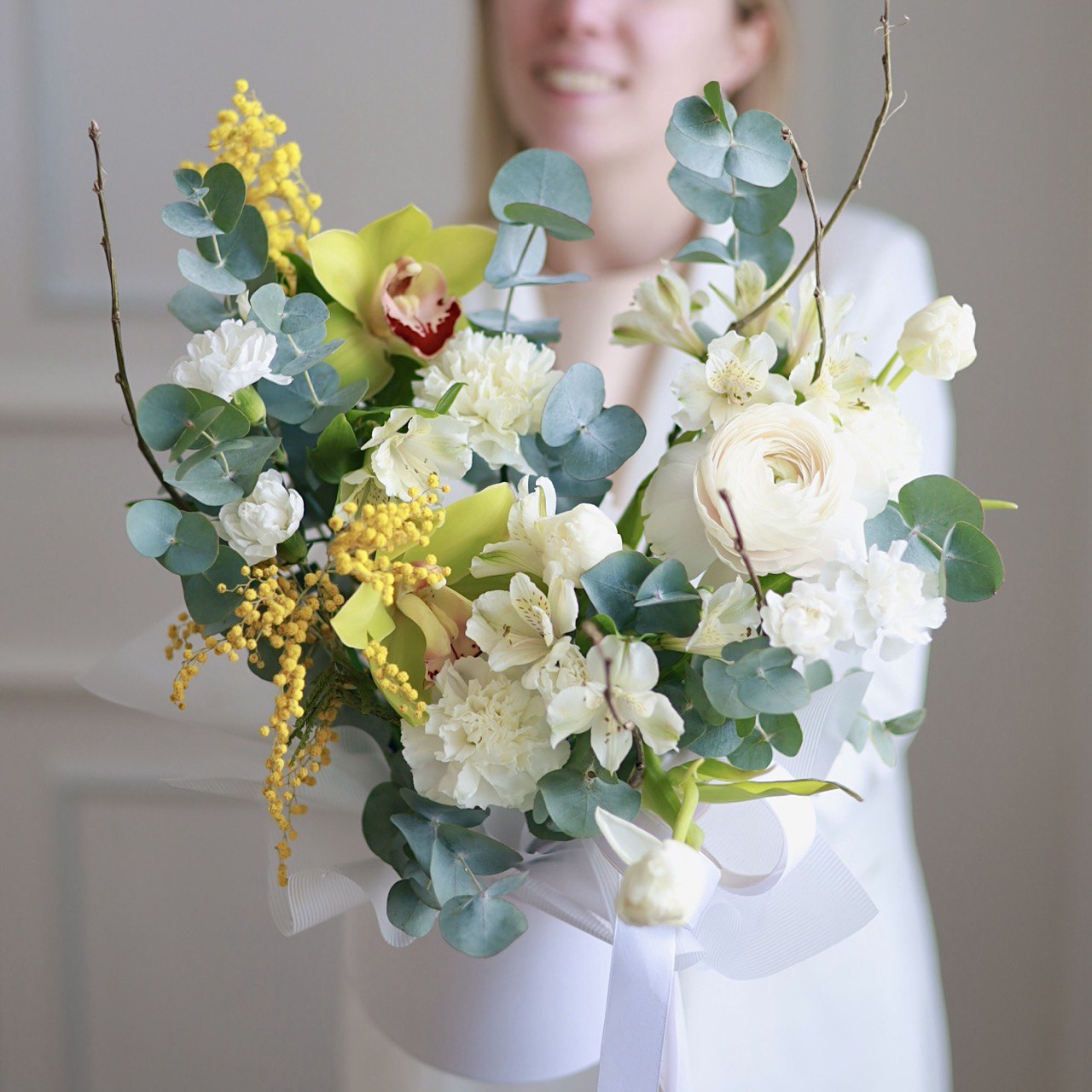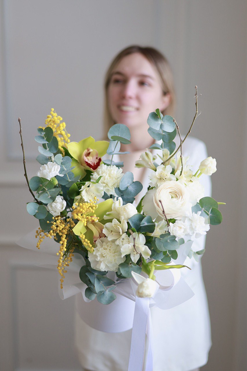 Состав: ранункулюс, орхидеи, стойкие диантусы, альстромерии, тюльпаны, мимоза и эвкалипт.