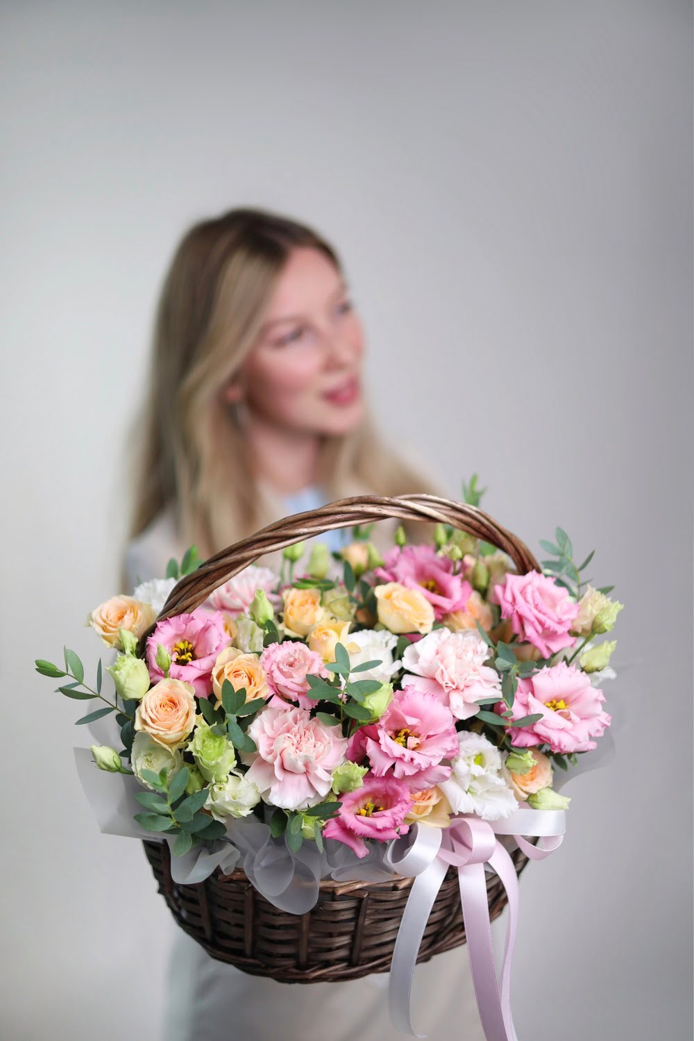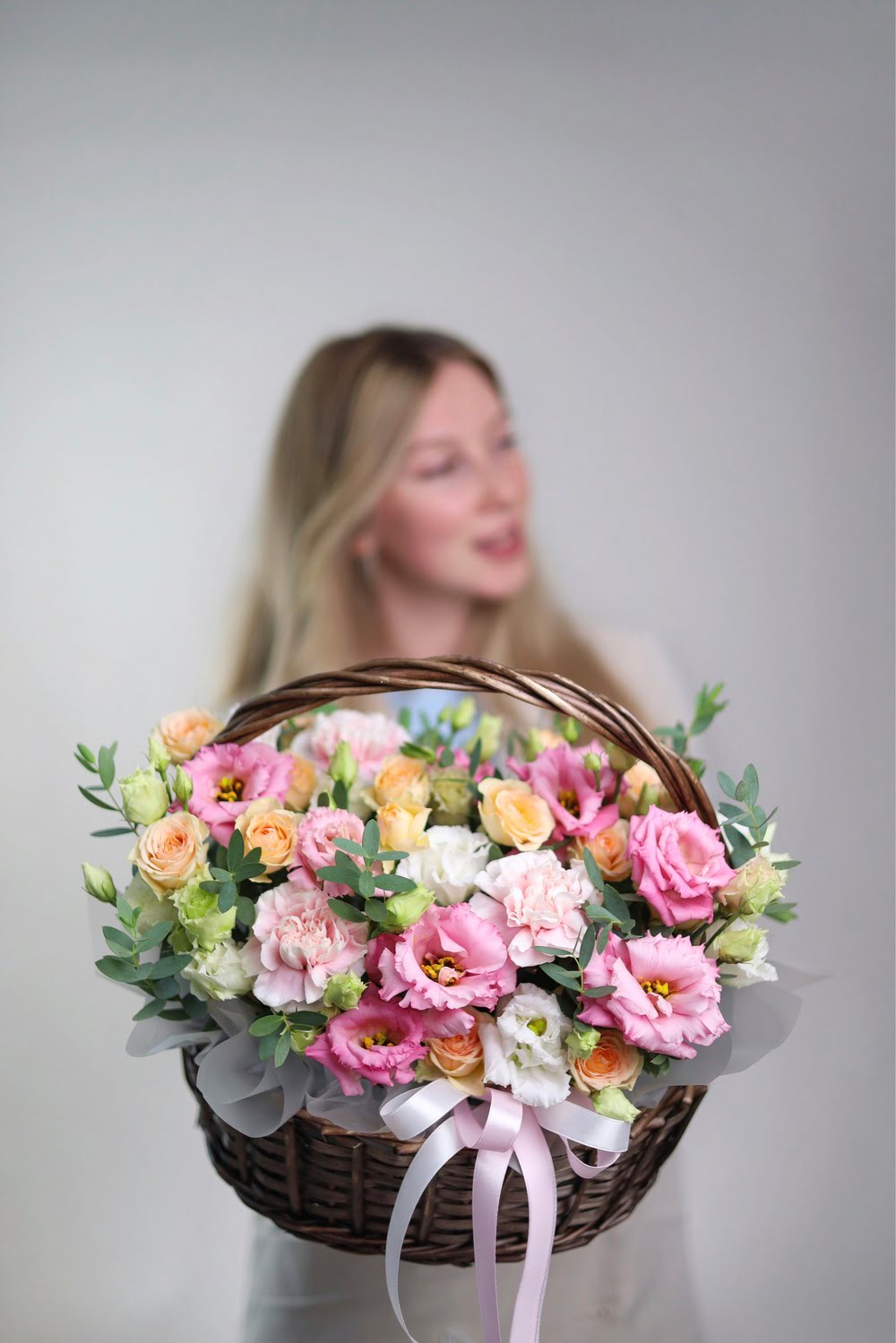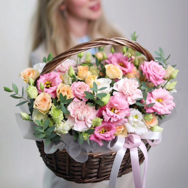 Великолепная корзинка со стойкой эустомой и кустовыми розочками.