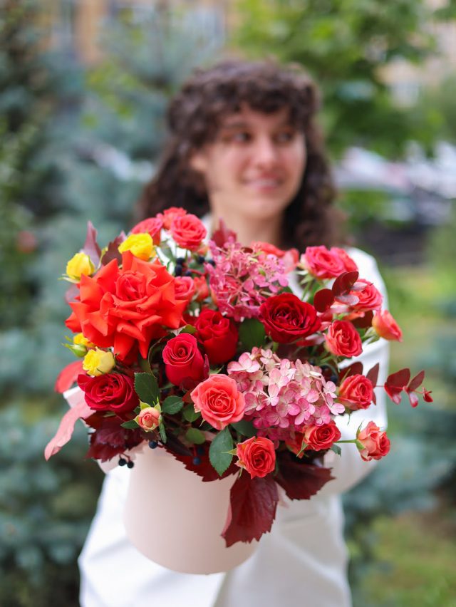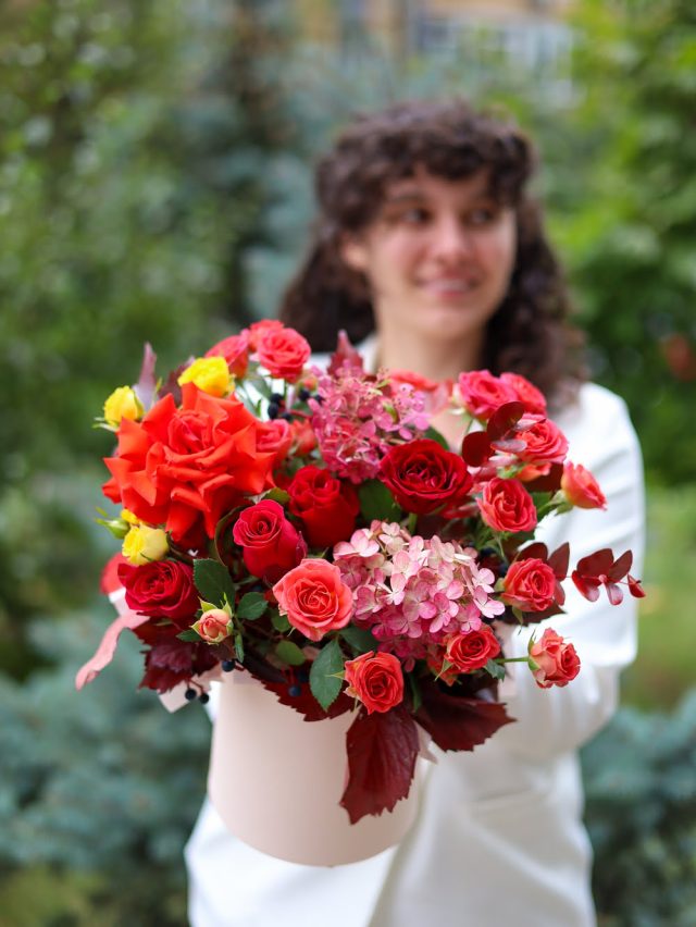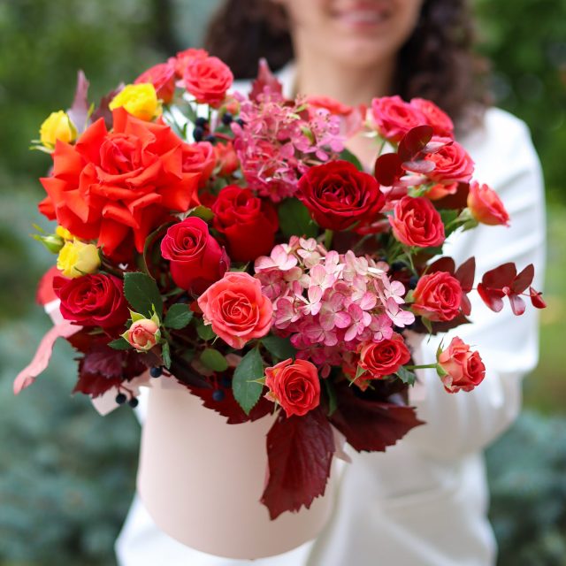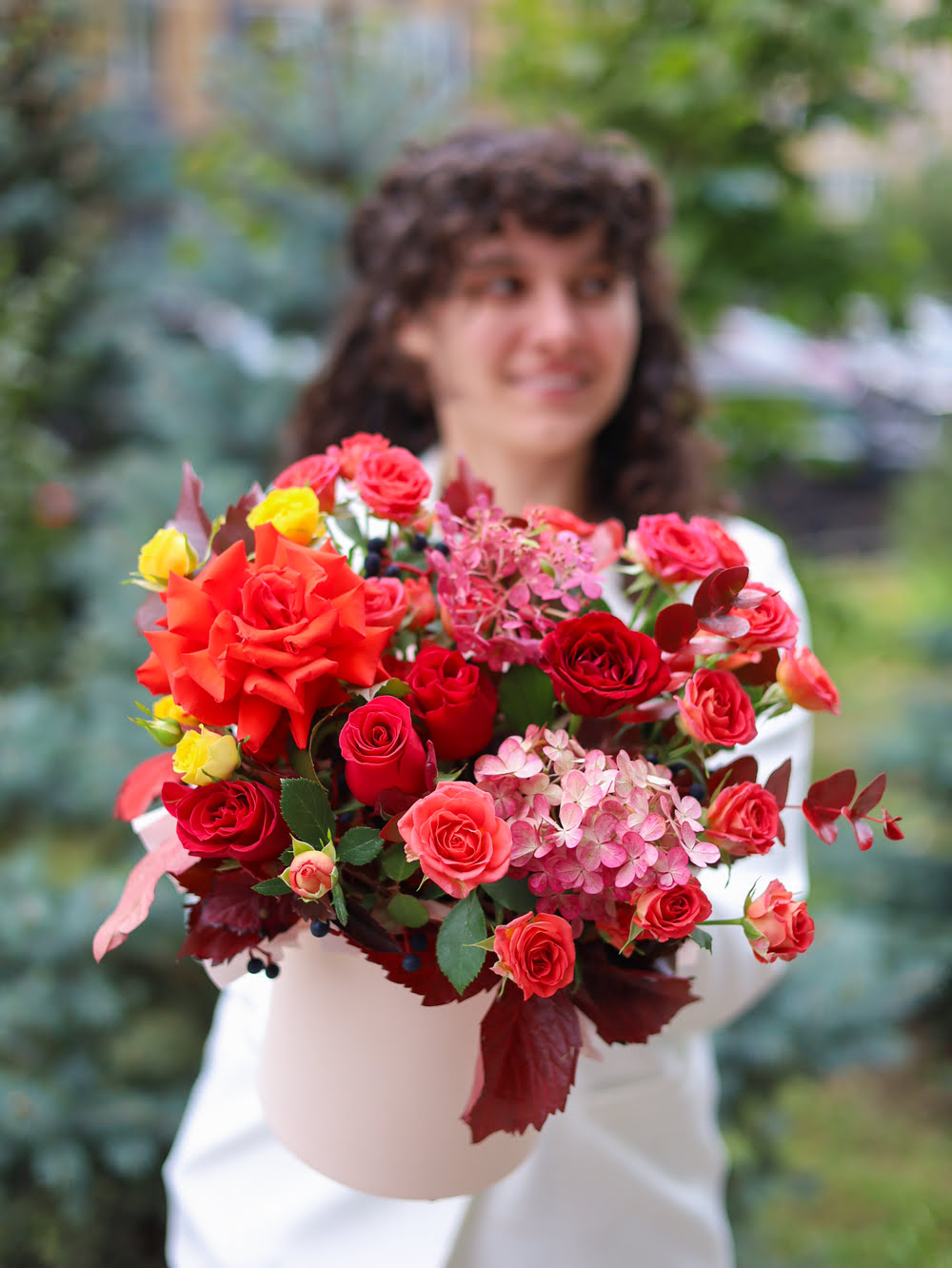 Состав: пышные гортензии, французские, одноголовые и кустовые розы, крашеная зелень.