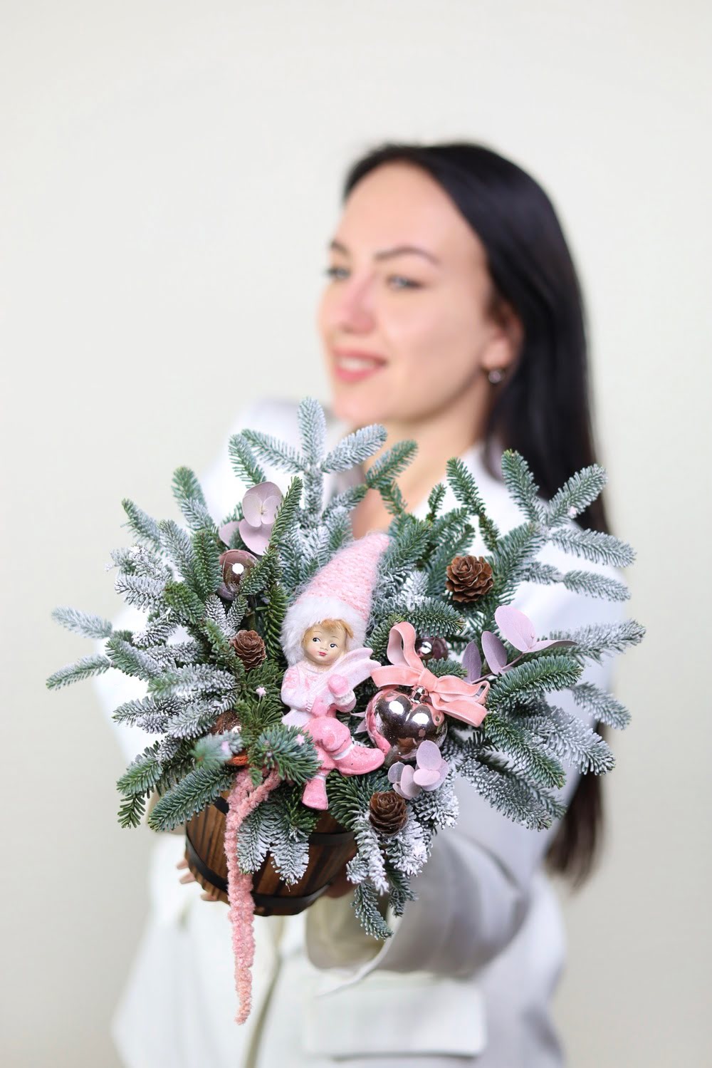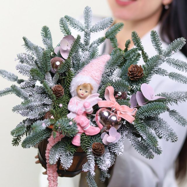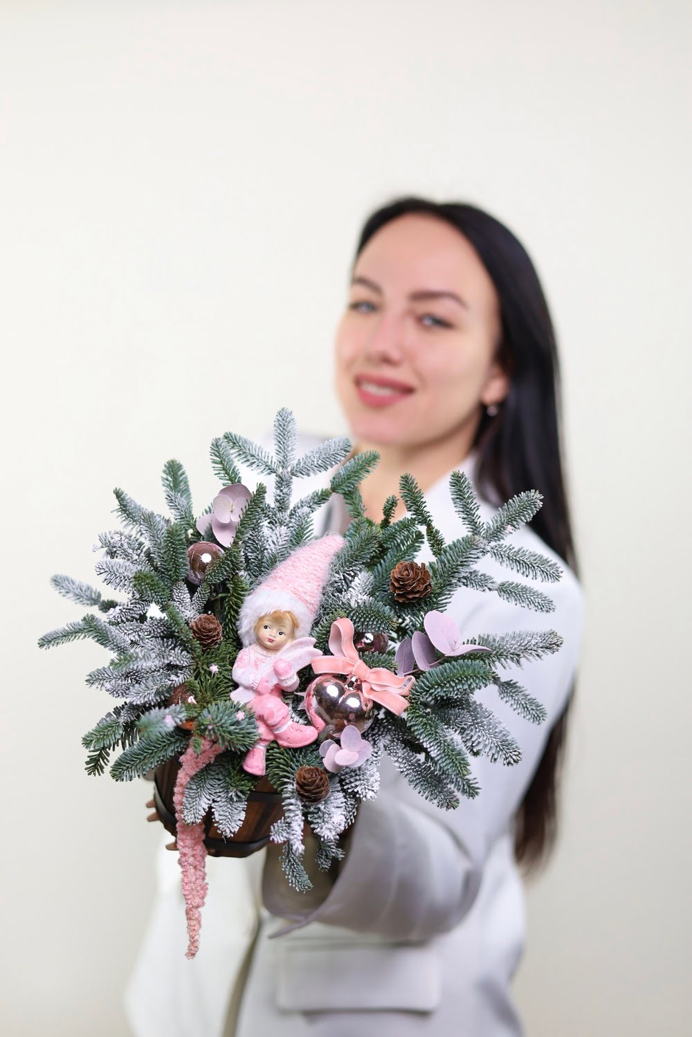 Состав: новогодний декор, шишки, крашеный эвкалипт, нобилис, фигурка. Высота около 25-30 см.