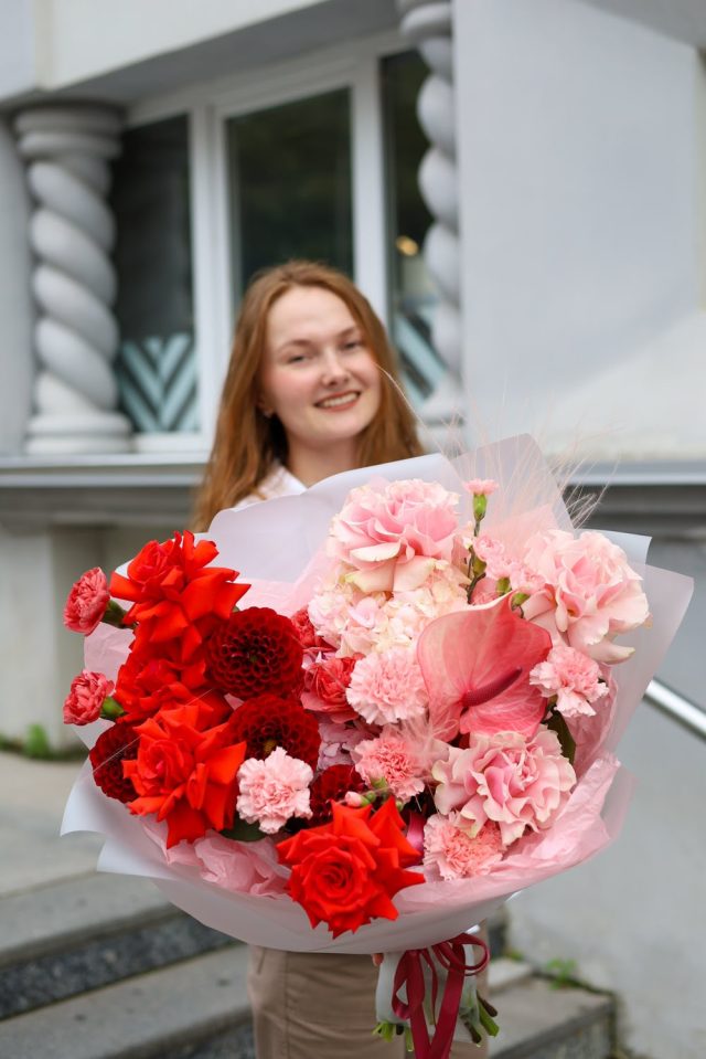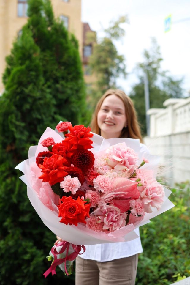 Вне сезона антуриум и георгины будут заменены на подходящий цветок. Высота букета не менее 50 см.