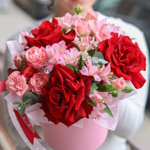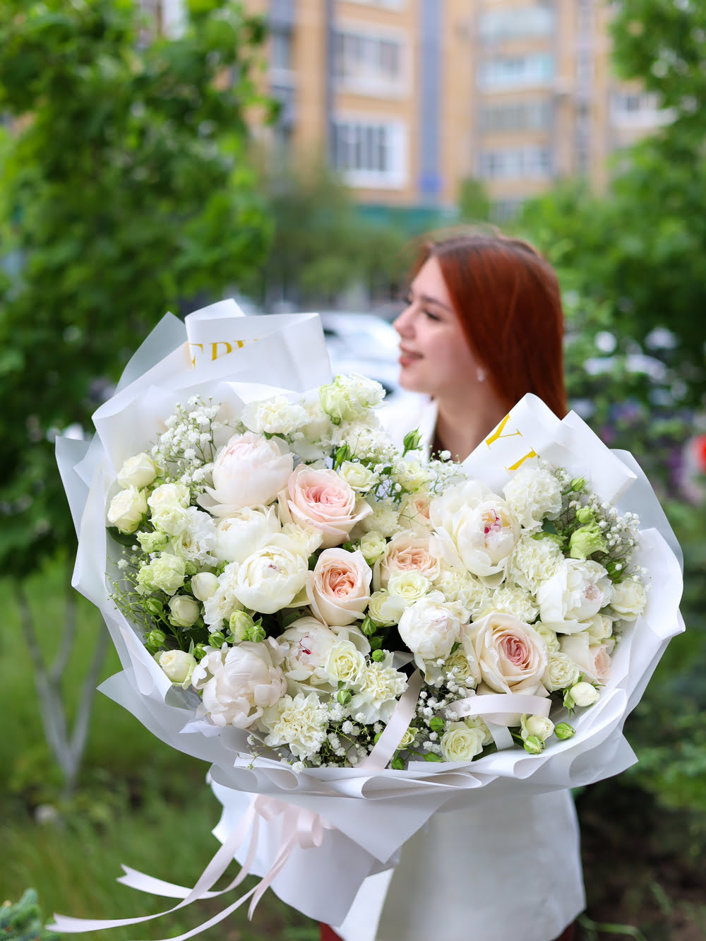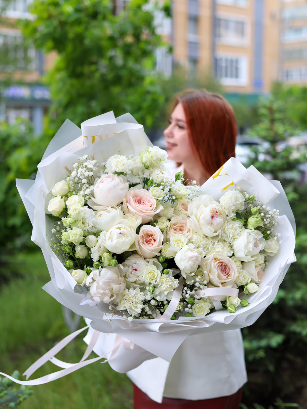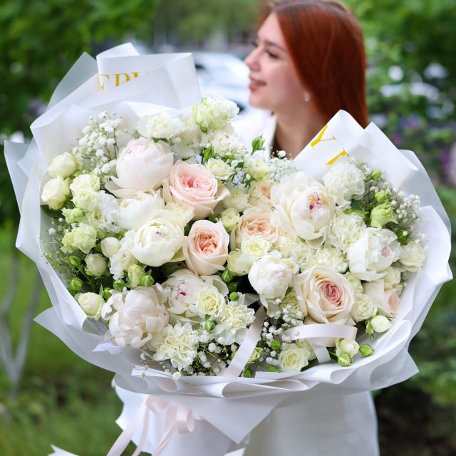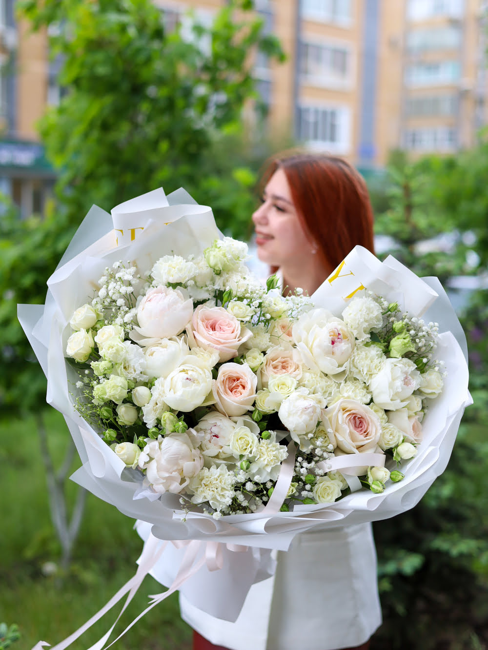 В букете: крупные пионы, стойкие диантусы и гипсофила, кустовые розы, ажурная эустома, одноголовые пионовидные розы. Высота не менее 50 см.