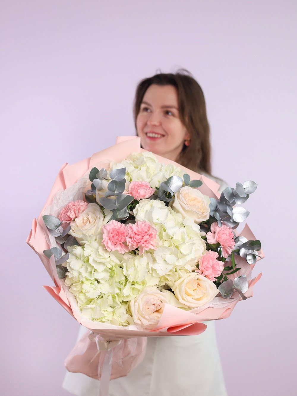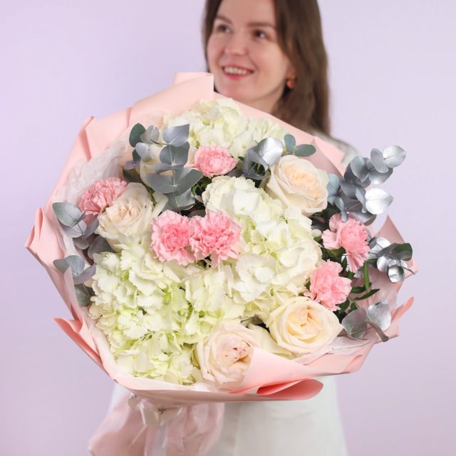 В букете: пышные гортензии, стойкие диантусы, ароматные пионовидные розы, ажурная эустома, крашеный эвкалипт.